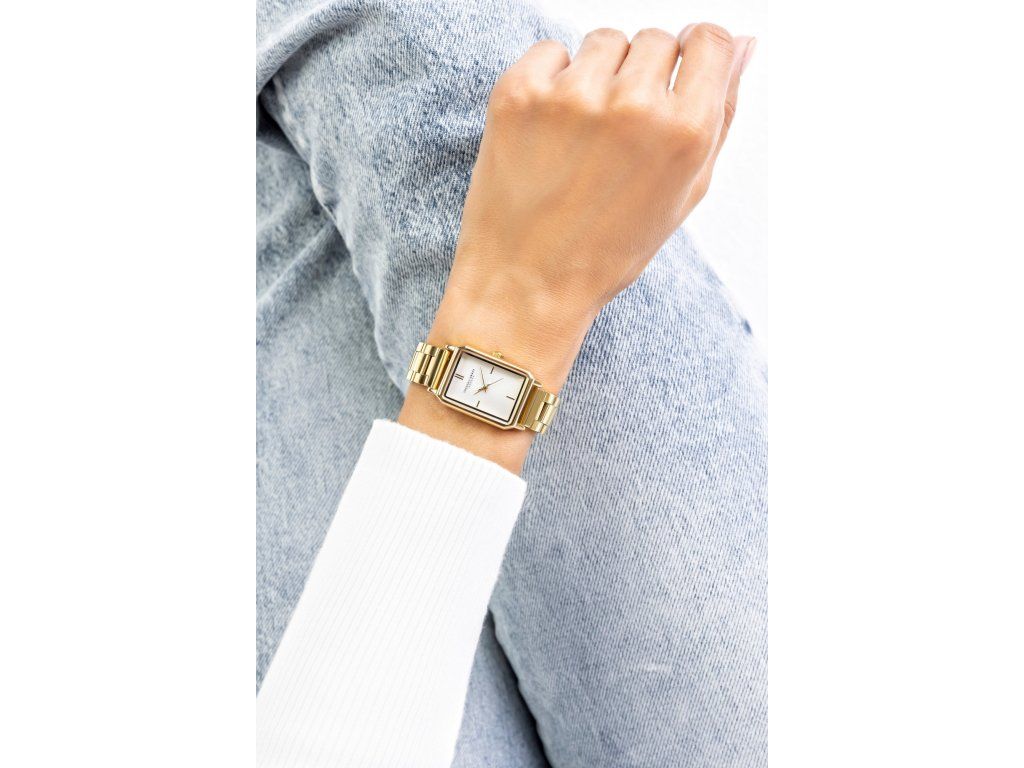 Biely ciferník v tvare štvorca krásne kontrastuje soceľový ťah v zlatej farbektorý pôsobí elegantne a nenápadne.Zlatý tón puzdra zjednocuje celý dizajn a vytvára vyvážený a vkusný celok. Minerálne sklíčko chráni ciferník počas každodenného nosenia, aby boli hodinky dlho krásne. Tento model je ideálny pre ženy, ktoré hľadajú jednoduchý a zároveň sofistikovaný doplnok.