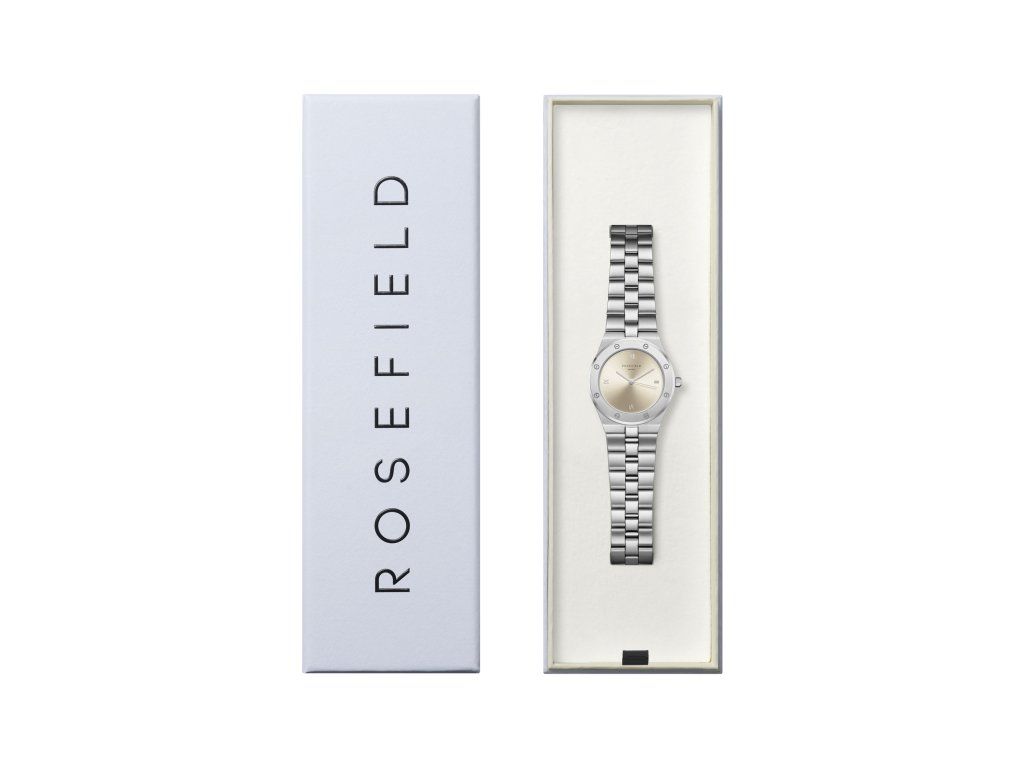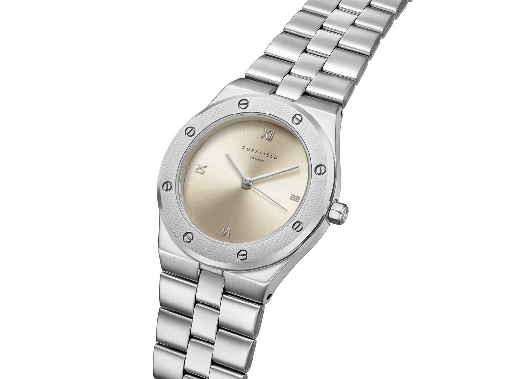 Dámske hodinky Rosefield Creme Sunray Rose Silver sú elegantným modelom s okrúhlym puzdrom, ciferníkom v krémovej farbe a oceľovým strojčekom v striebornej farbe. Vyzerajú čisto, štýlovo a vďaka výraznejším proporciám prirodzene upútajú pozornosť.