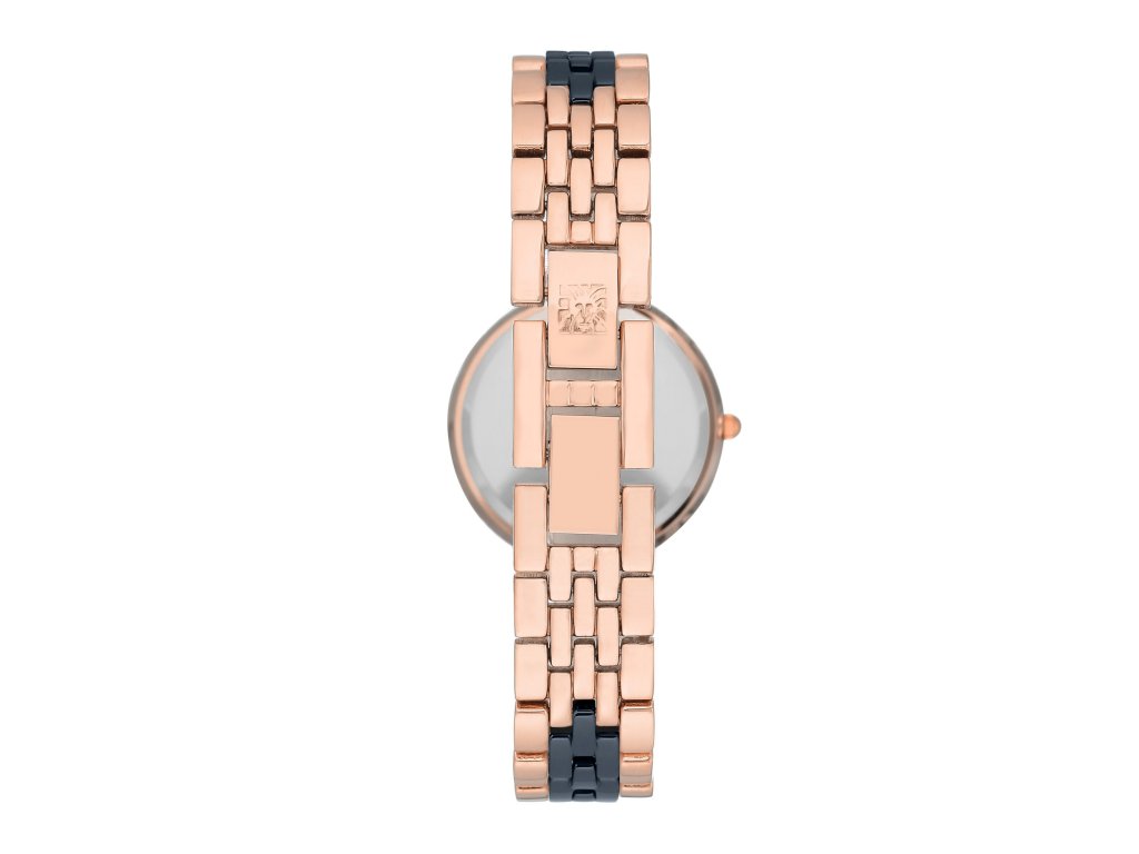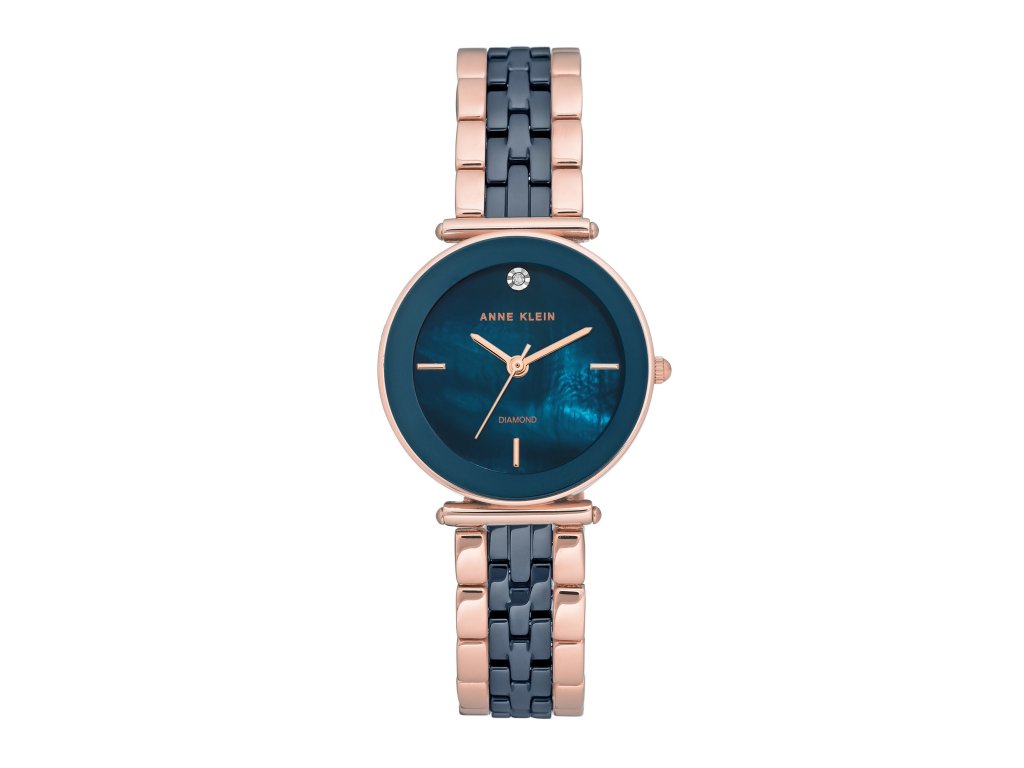 Tieto hodinky Anne Klein zaujmú na prvý pohľad svojou farbou a detailmi.Modrý ciferník s diamantmi na pozícii 12 hodín vytvára sofistikovaný kontrast k teplému tónu ružového zlata.