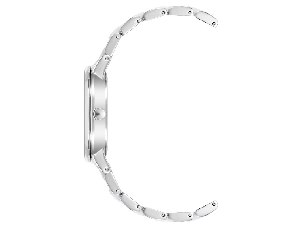 Kovové ťahadlo zložené z článkov striebornej farby je nielen odolný, ale aj elegantný. Okrúhle puzdro rovnakej farby dokonale dopĺňa celkový dizajn hodiniek a dodáva im šarm. Biely ciferník s priemerom 37 mm je vybavený striebornými ručičkami a indexmi, ktoré zaisťujú výbornú čitateľnosť a zároveň podčiarkujú estetiku hodiniek. Fialové detaily vytvárajú harmonický kontrast s bielym podkladom a dodávajú hodinkám eleganciu.