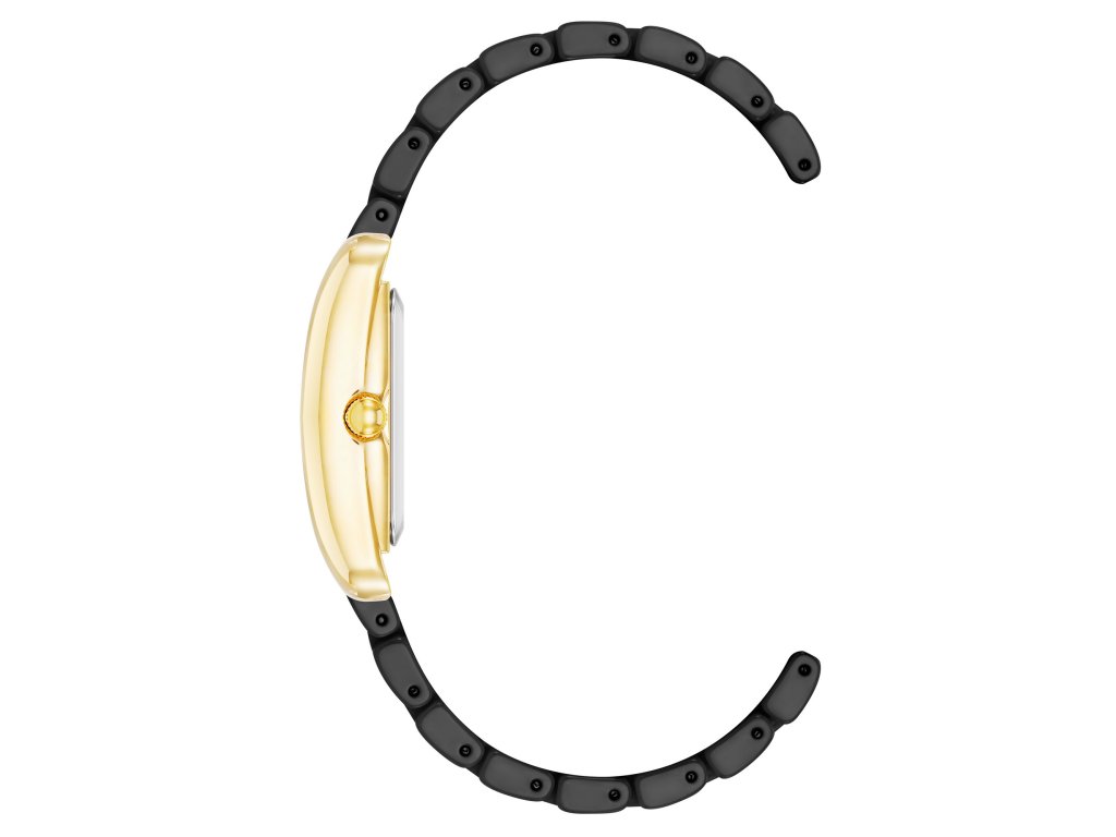 Tieto hodinky sa vyznačujúkovový ťah v čiernej farbečo zaručuje nielen odolnosť, ale dodáva hodinkám aj osobitý estetický vzhľad. Štvorcové puzdro v zlatej farbe vytvára kontrast s čiernym ciferníkom, ktorý je dokonale zladený so zlatými ručičkami a indexmi. Tie vynikajú nielen svojou farbou, ale aj precíznymi detailmi.