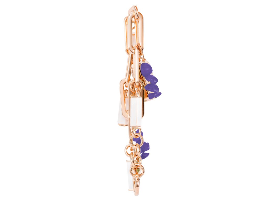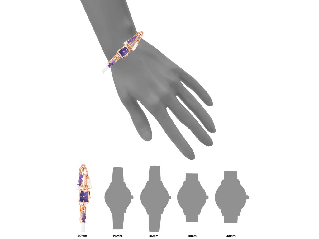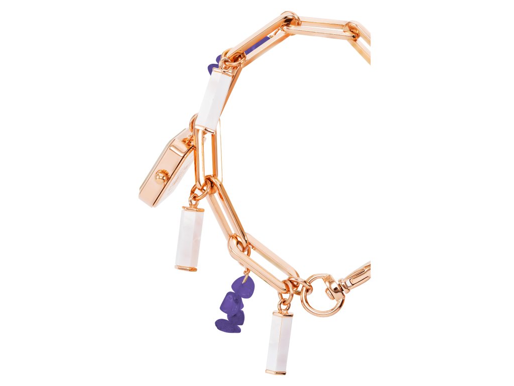 Ciferník je ukotvený na kovovej retiazke v odtieni ružového zlata. Zdobí ho niekoľko ozdobných príveskov a fialové kamene. Ružovo-zlaté puzdro štvorcového tvaru vyniká svojím jedinečným odtieňom, ktorý dokonale ladí s fialovým ciferníkom, ktorému dominujú jemné zlaté indexy a elegantné ručičky.