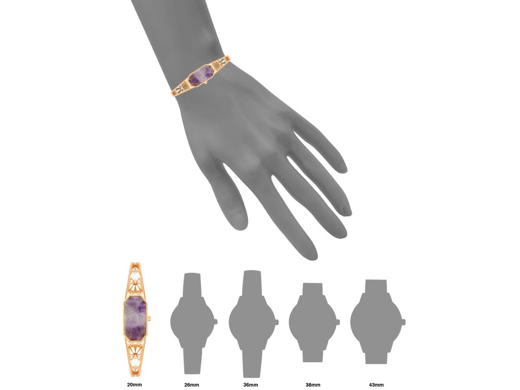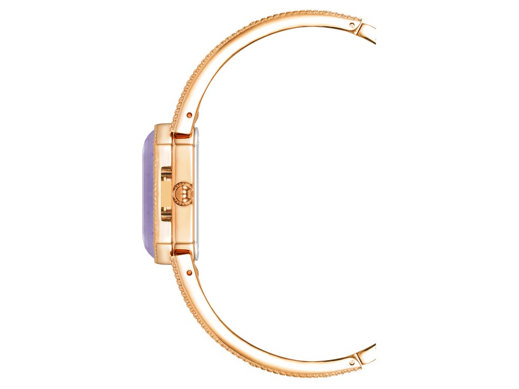 Dizajn zdobeného kovového náramku je pre hodinky veľmi netradičný, ale jeho ružovozlatý odtieň dokonale ladí s puzdrom,kde je ciferník ukrytý pod fialovým kameňom, zdobený jemnými zlatými ručičkami a jemnými indexmi. Tento dizajn vytvára harmonický a sofistikovaný vzhľad, ktorý nikdy nevyjde z módy.
