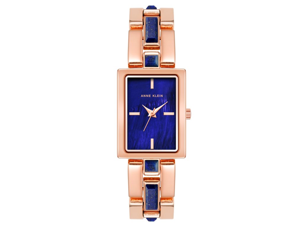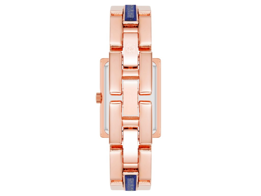 Sofistikované ťahanie pozostávajúce z dvoch radov kovových článkov v ružovom zlate po stranách a jedného radu článkov v modrej farbe uprostred sa vyznačuje jemným leskom a luxusným vzhľadom. Štvorcové puzdro je tiež celé z ružového zlata. Modrý ciferník dodáva hodinkám osobitý a moderný vzhľad. Tento ohromujúci kontrast podčiarkuje eleganciu celého dizajnu doplnku.