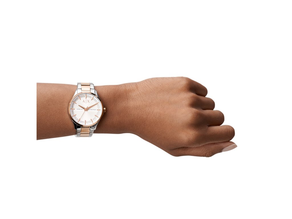 Hodinky kombinujú dvojfarebný dizajn v striebornom a ružovom zlate.Ciferník s jemným saténovým povrchom je vybavený elegantnými ručičkami, indexmi a svietiacimi kryštálmi po obvode.