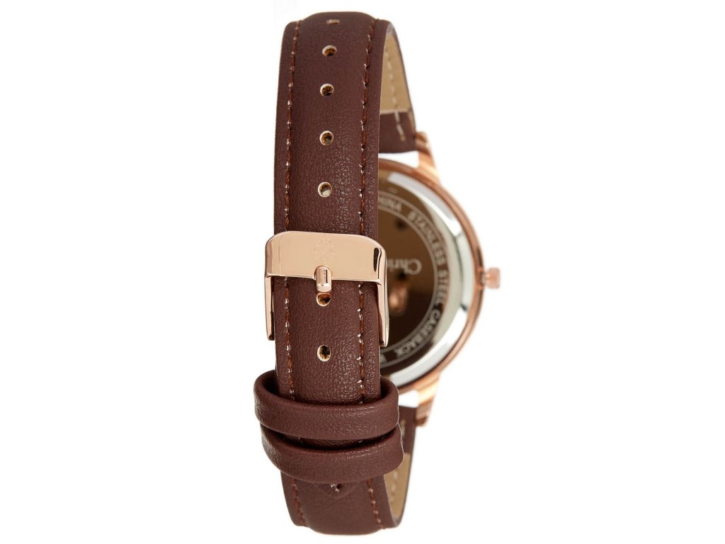 Tieto dámske hodinky s hnedým remienkom majú na ciferníku veľké logo CXL, sú celé pozlátené ružovým zlatom a na lunete zdobené sklenenými kamienkami.