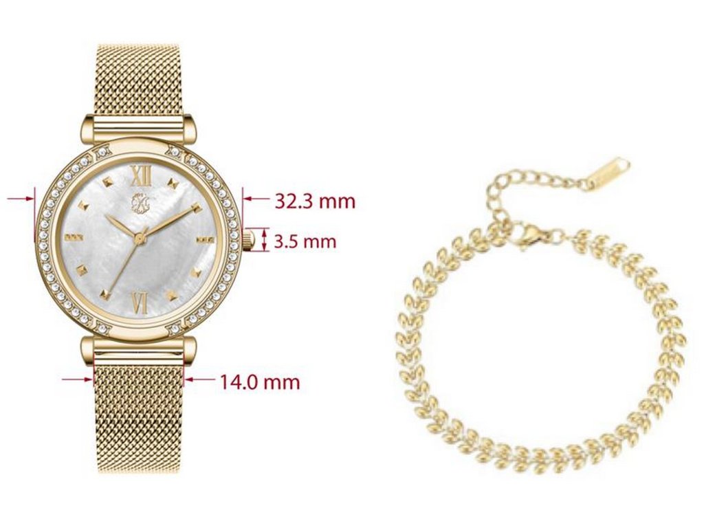 Elegantná darčeková súprava CXL by Christian Lacroix spája štýlové dámske hodinky a jemný náramok do jednej harmonicky zladenej súpravy. Zlatá povrchová úprava dodáva celku nadčasovú eleganciu, zatiaľ čo perleťový ciferník a trblietavé kryštály na puzdre prinášajú šperk, ktorý je ideálny na špeciálne príležitosti.