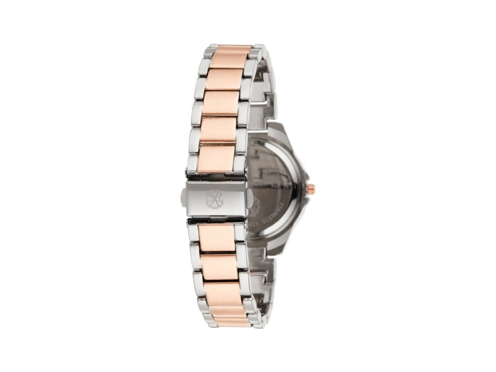 Kovový ťah v ružovom zlate a striebre zdobený mnohými kryštálmi sa hodí ku okrúhlemu puzdruv harmonickom dvojfarebnom dizajne doplnenom trblietavými detailmi. Kryštály po obvode puzdra a v samotnom ťahu podčiarkujú šperkársky charakter modelu.Model je vybavený presným strojčekom Quartz a chránený minerálnym sklíčkom.