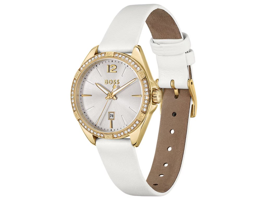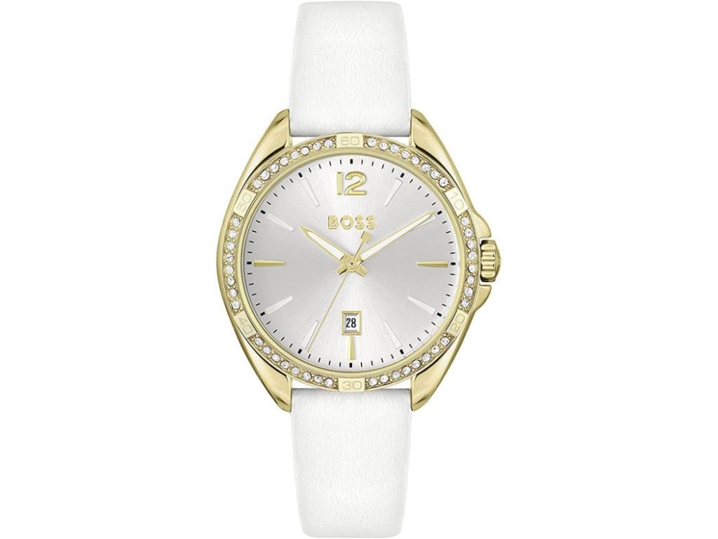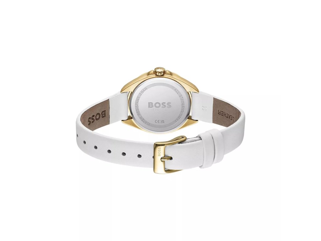 HODINKY BOSS WOMEN 1502619 (39MM). Typ mechanizmu: QUARTZ. Displej: HODINKY: ANALÓGOVÉ. Materiál puzdra: MATERIÁL: NEHRDZAVEJÚCA OCEĽ. Farba puzdra: FARBA: ZLATÁ. Materiál náramku: MATERIÁL NÁRAMKU: NEHRDZAVEJÚCA OCEĽ. Farba náramku: FARBA NÁRAMKU: BIELA. Farba ciferníka: BIELA. Typ skla: SKLÍČKO: MINERÁLNE. Kľučka: BUCKLE. Priemer ciferníka: dĹŽKA CIFERNÍKA: 39 MM. Ponorný: hĹBKA: 3ATM