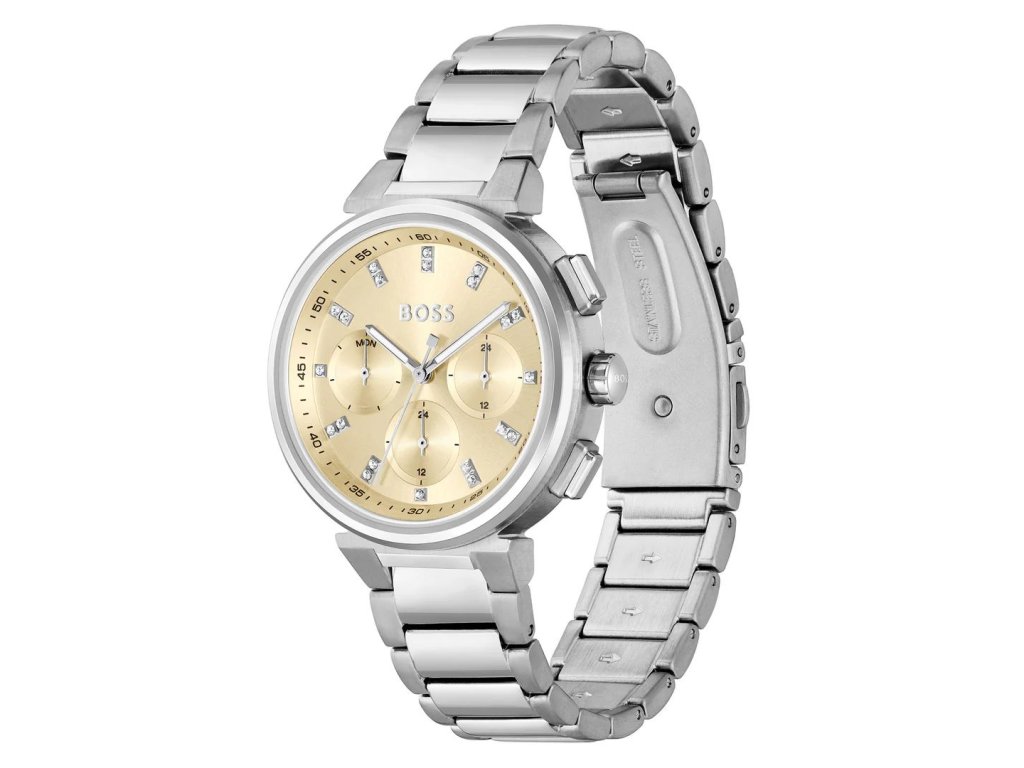 HODINKY BOSS WOMEN 1502676 (37MM). Typ mechanizmu: QUARTZ. Displej: HODINKY: ANALÓGOVÉ. Materiál puzdra: MATERIÁL: NEHRDZAVEJÚCA OCEĽ. Farba puzdra: STRIEBORNÁ: FARBA PUZDRA: STRIEBORNÁ. Materiál náramku: MATERIÁL NÁRAMKU: NEHRDZAVEJÚCA OCEĽ. Farba náramku: STRIEBORNÁ FARBA NÁRAMKU. Farba ciferníka: ZLATÁ. Typ skla: SKLÍČKO: MINERÁLNE. Sklo: TLAK. Priemer ciferníka: dĹŽKA CIFERNÍKA: 37 MM. Ponorný: NE