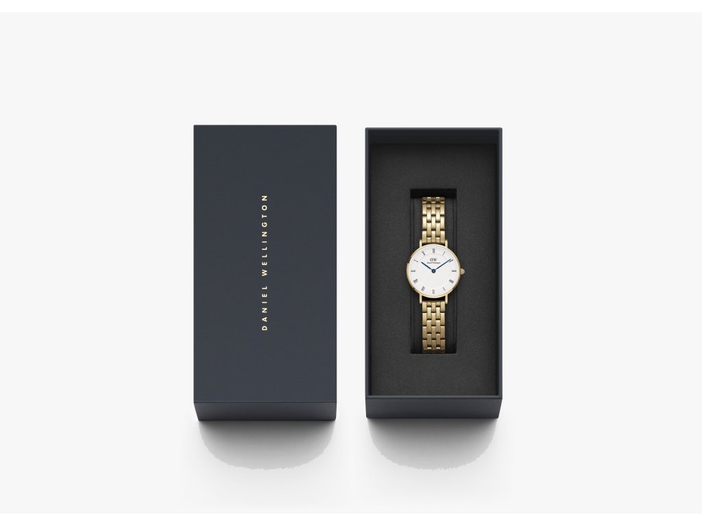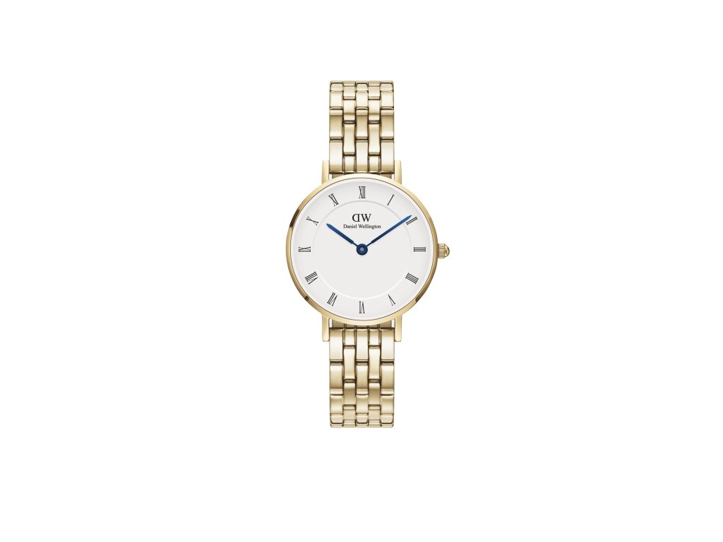 Dámske hodinky Petite Roman Numerals 5-Link Gold od Daniel Wellingtonelegantný vintage vzhľad s moderným štýlom.