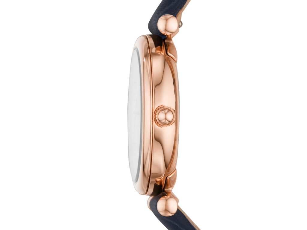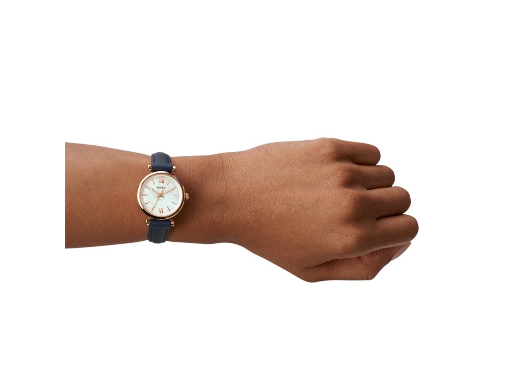 Dámske hodinky Fossil Carlie v mini verzii osloví ženy, ktoré majú rady decentné a štýlové doplnky. Kombinácia perleťového ciferníka, elegantného modrého koženého remienka a puzdra z ružového zlata vytvára harmonický celok vhodný na bežné nosenie aj formálnejšie príležitosti.