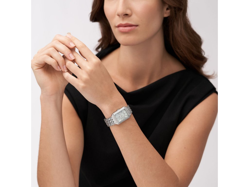 Hodinky Raquel sú jedinečnou kombináciou vintage inšpirácie a súčasnej elegancie. Je úzky, sofistikovaný a výnimočný svojím štvorcovým perleťovým ciferníkom s kryštálmi.