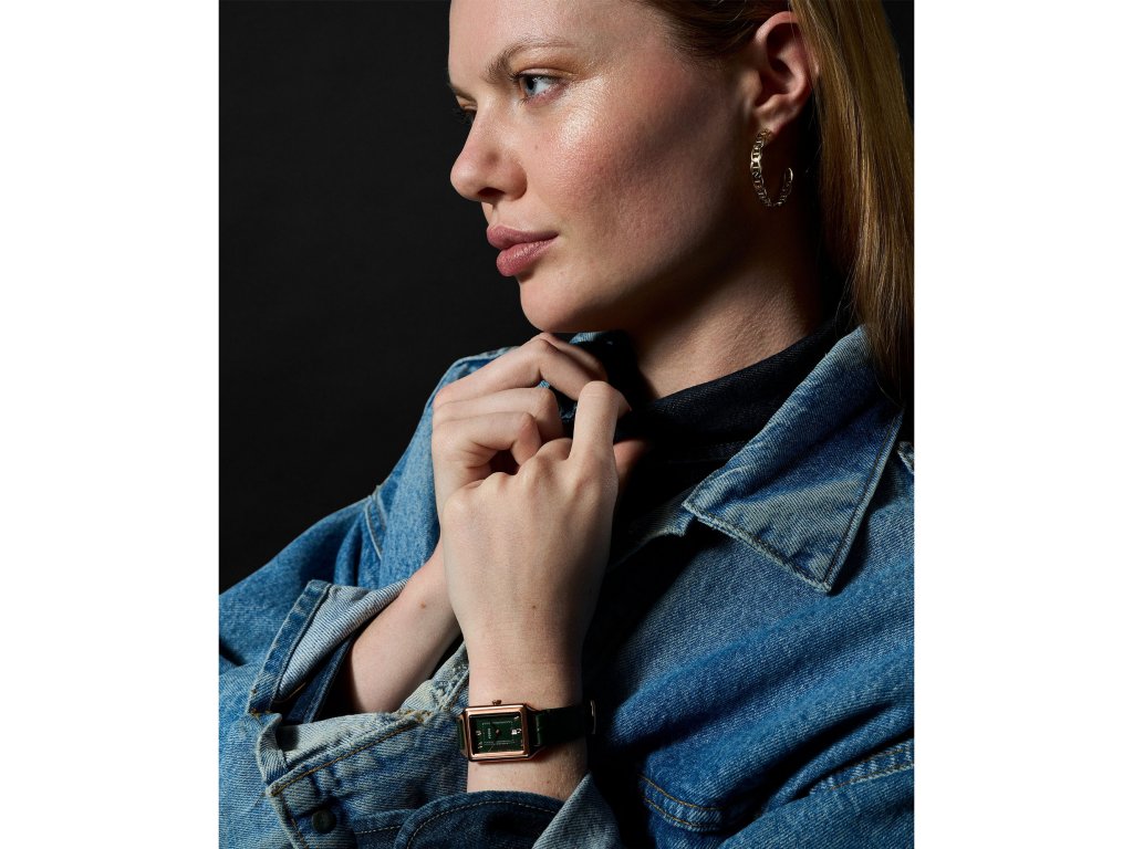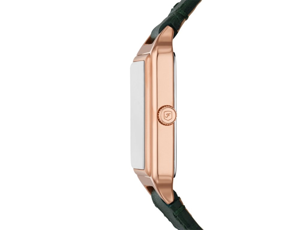 Decentné obdĺžnikové puzdro z nehrdzavejúcej ocele v ružovozlatom vyhotovení dokonale ladí so zeleným ciferníkom, ktorý obsahuje tri ručičky, ukazovateľ dátumu a indexy s rímskymi číslicami.