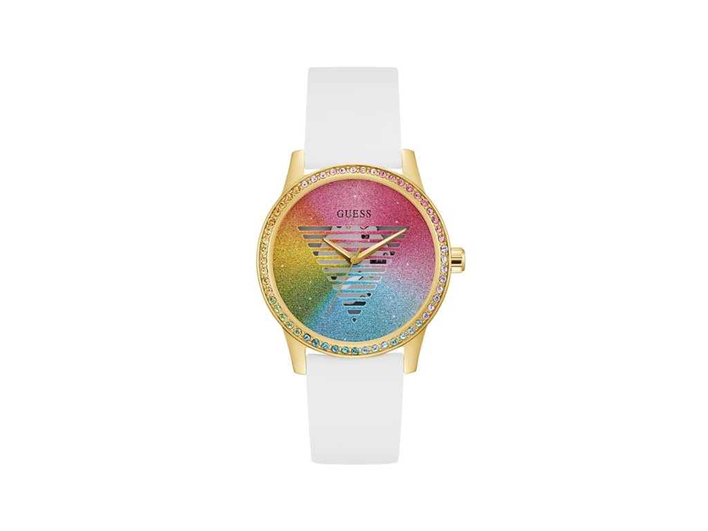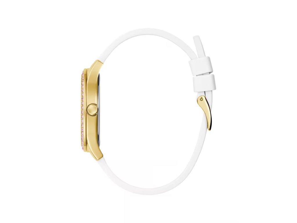 HODINKY GUESS WOMEN GW0589L1 (40MM). Typ mechanizmu: QUARTZ. Displej: HODINKY: ANALÓGOVÉ. Materiál puzdra: MATERIÁL: NEHRDZAVEJÚCA OCEĽ. Farba puzdra: FARBA: ZLATÁ. Materiál náramku: MATERIÁL NÁRAMKU: SILIKÓN. Farba náramku: FARBA NÁRAMKU: BIELA. Farba ciferníka: FAREBNOSŤ CIFERNÍKA: VÍCFAREBNÁ. Typ skla: SKLÍČKO: MINERÁLNE. Kľučka: BUCKLE. Priemer ciferníka: dĹŽKA CIFERNÍKA: 40MM. Ponoriteľnosť: 5ATM