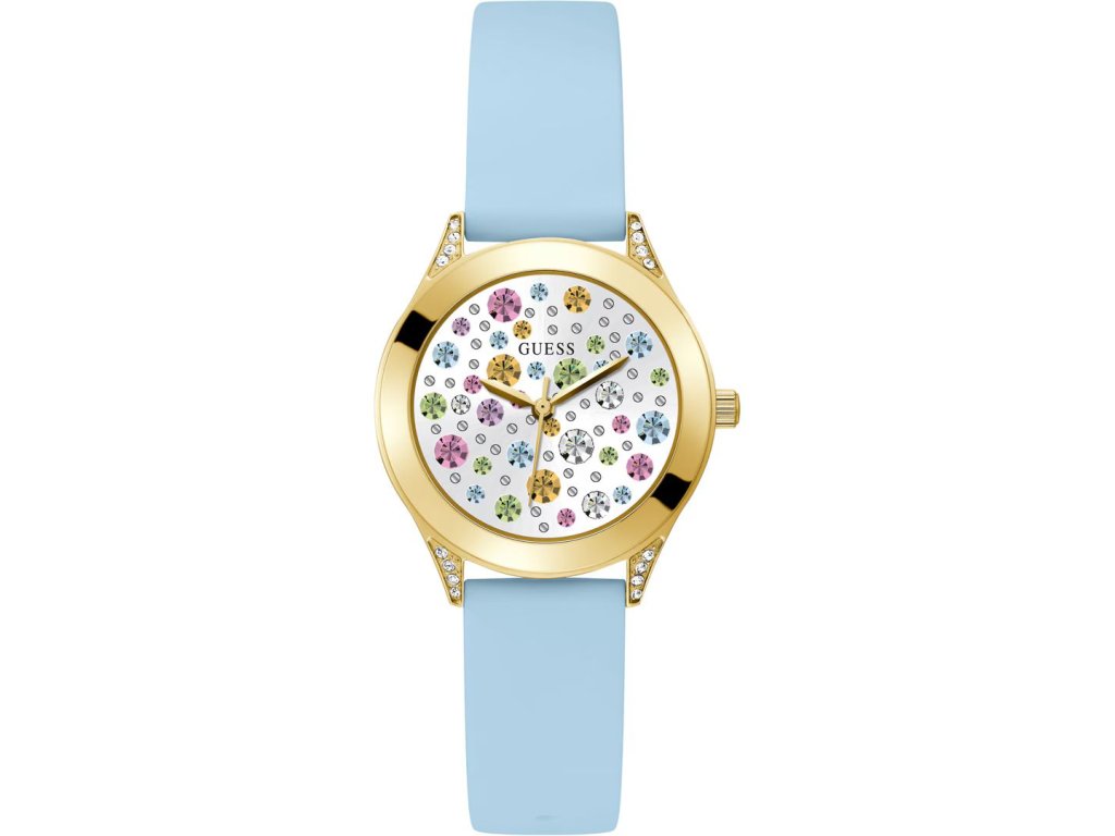 HODINKY GUESS WOMEN GW0678L1 (34MM). Typ mechanizmu: QUARTZ. Displej: HODINKY: ANALÓGOVÉ. Materiál puzdra: MATERIÁL: NEHRDZAVEJÚCA OCEĽ. Farba puzdra: FARBA: ZLATÁ. Materiál náramku: MATERIÁL NÁRAMKU: SILIKÓN. Farba náramku: FARBA NÁRAMKU: MODRÁ. Farba ciferníka: FAREBNOSŤ CIFERNÍKA: VÍCFAREBNÁ. Typ skla: SKLÍČKO: MINERÁLNE. Kľučka: BUCKLE. Priemer ciferníka: dĹŽKA CIFERNÍKA: 34 MM. Ponorný: NE
