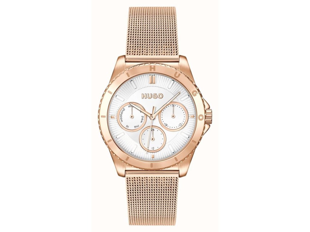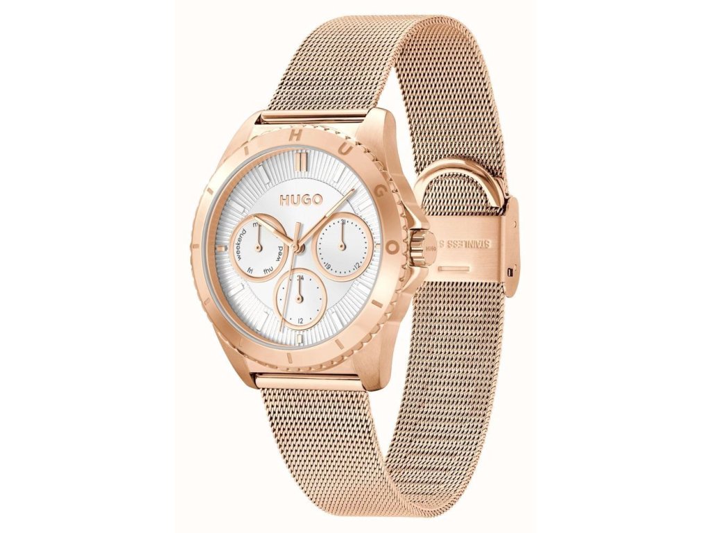 HODINKY HUGO WOMEN 1540161 (36MM). Typ mechanizmu: QUARTZ. Displej: HODINKY: ANALÓGOVÉ. Materiál puzdra: MATERIÁL: NEHRDZAVEJÚCA OCEĽ. Farba puzdra: FARBA: ZLATÁ. Materiál náramku: MATERIÁL NÁRAMKU: NEHRDZAVEJÚCA OCEĽ. Farba náramku: ZLATÁ. Farba ciferníka: BIELA. Typ skla: SKLÍČKO: MINERÁLNE. Clousure: TLAK. Priemer ciferníka: dĹŽKA CIFERNÍKA: 36 MM. Ponorný: NE