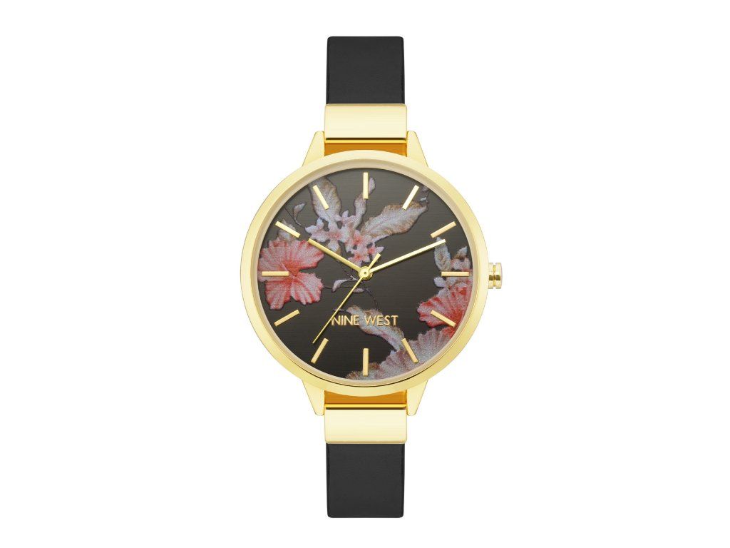 Dámske elegantné hodinky so ženským kvetinovým vzorom. Čierny ciferník so zlatými detailmi a čiarovými indexmi. Remienok hodiniek kombinuje zlaté kovanie s čiernym, koženkovým remienkom, ktorý je ľahko nastaviteľný.