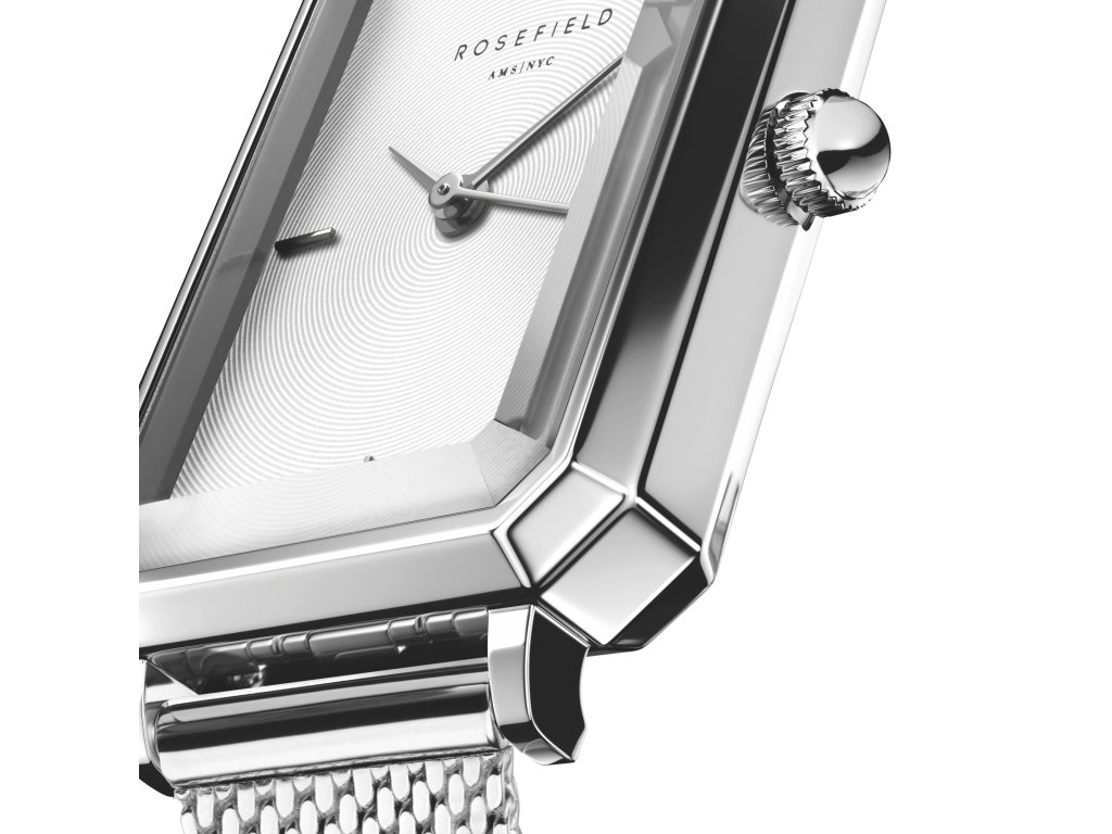 Dámske hodinky Rosefield Octagon XS Mesh Silvermoderný koncept elegancie inšpirovaný estetikou 20. rokov 20. storočia. Osemuholníkové puzdro v striebornej farbe odkazuje na geometrické línie štýlu art deco, ktoré hodinkám dodávajú originálny a nadčasový charakter.