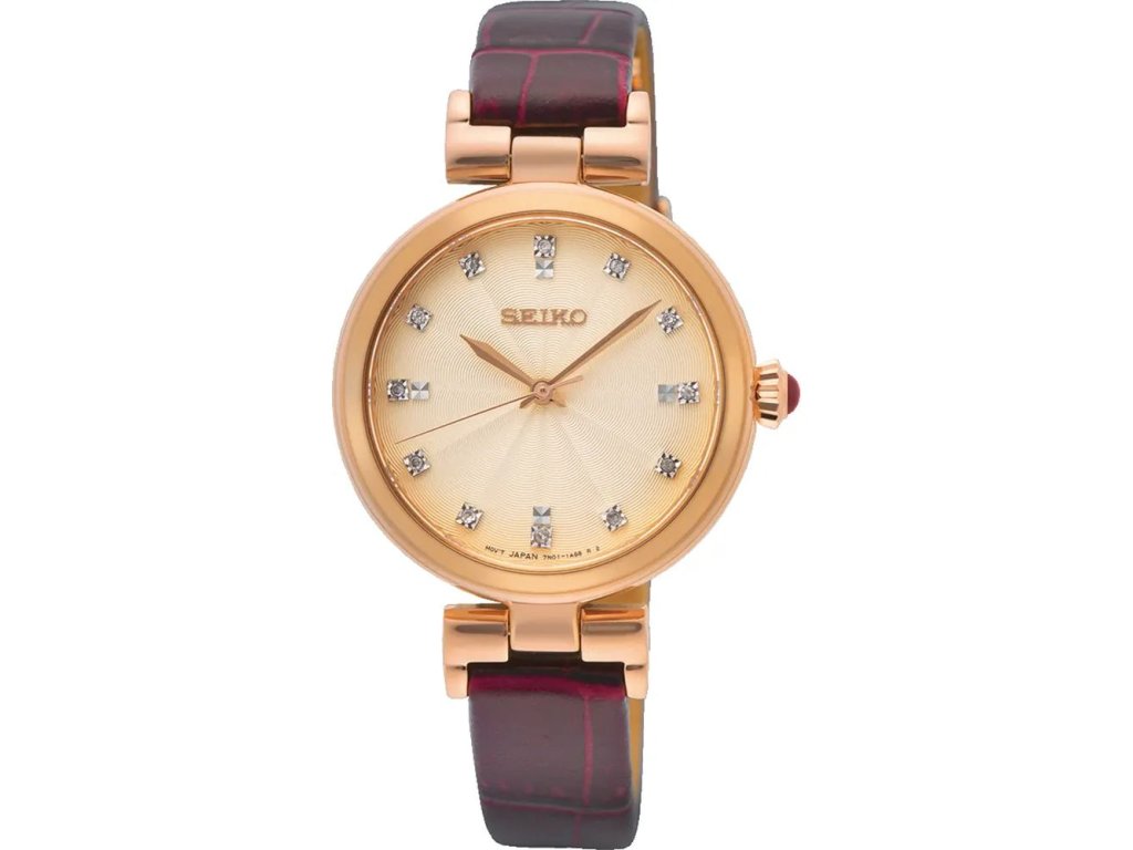 HODINKY SEIKO WOMEN SRZ548P1 (30MM). Typ mechanizmu: QUARTZ. Displej: HODINKY: ANALÓGOVÉ. Materiál puzdra: MATERIÁL: NEHRDZAVEJÚCA OCEĽ. Farba puzdra: FARBA: ZLATÁ. Materiál náramku: MATERIÁL NÁRAMKU: KOŽA. Farba náramku: FARBA NÁRAMKU: ČERVENÁ. Farba ciferníka: ZLATÁ. Typ skla: TYP SKLA: SAPPHIRE. Kľučka: BUCKLE. Priemer ciferníka: dĹŽKA CIFERNÍKA: 30 MM. Ponoriteľnosť: 5ATM