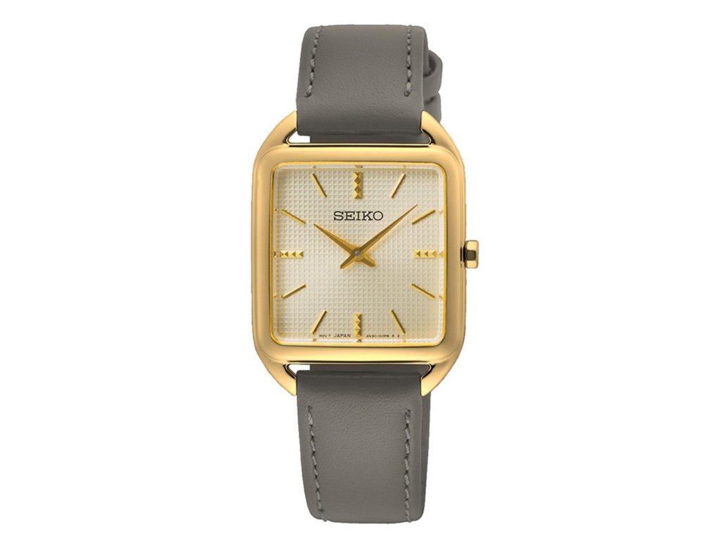HODINKY SEIKO WOMEN SWR090P1 (26MM). Typ mechanizmu: QUARTZ. Displej: TYP: ANALÓGOVÝ. Materiál puzdra: MATERIÁL: NEHRDZAVEJÚCA OCEĽ. Farba puzdra: FARBA: ZLATÁ. Materiál náramku: MATERIÁL NÁRAMKU: KOŽA. Farba náramku: FARBA NÁRAMKU: ŠEDÁ. Farba ciferníka: ZLATÁ. Typ skla: TYP SKLA: HARDLEX. Kľučka: BUCKLE. Priemer ciferníka: dĹŽKA CIFERNÍKA: 26 MM. Ponoriteľnosť: 5ATM