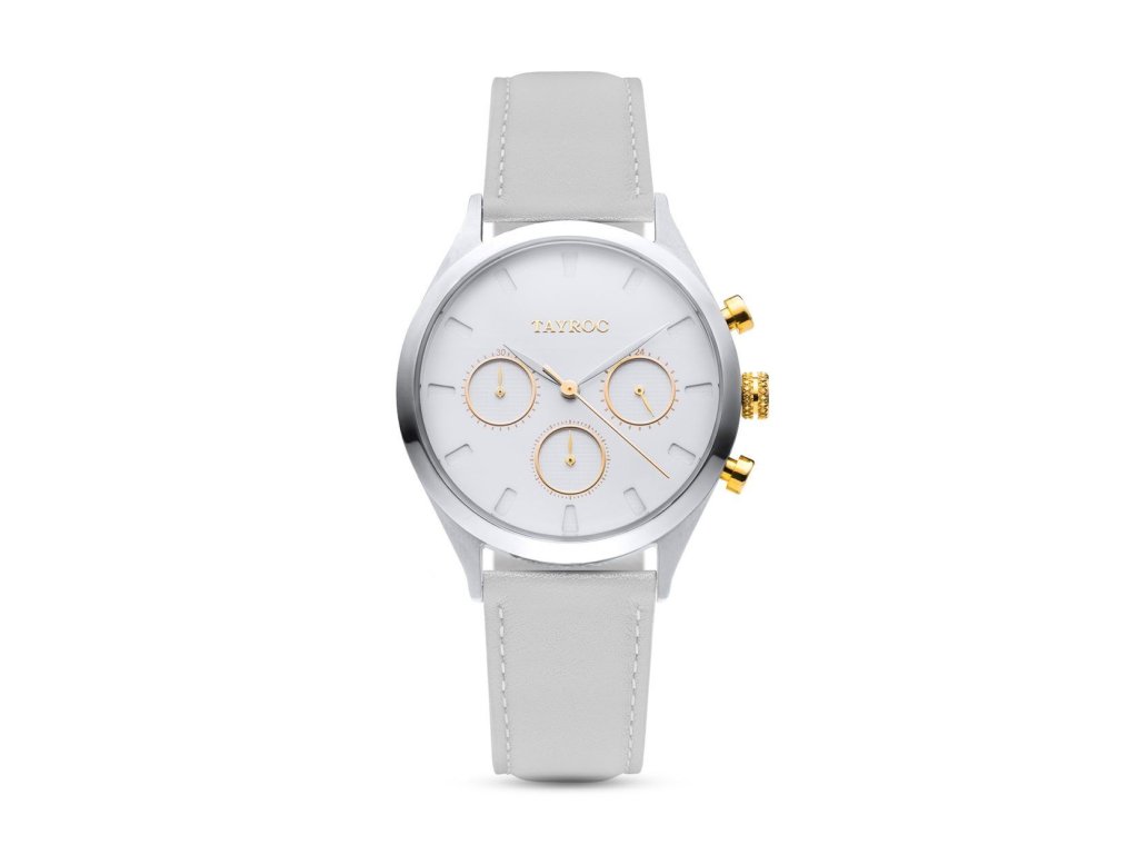 HODINKY TAYROC WOMEN TY61 (36MM). Typ mechanizmu: QUARTZ. Displej: HODINKY: ANALÓGOVÉ. Materiál puzdra: MATERIÁL: NEHRDZAVEJÚCA OCEĽ. Farba puzdra: FARBA PUZDRA: ŠEDÁ. Materiál náramku: MATERIÁL NÁRAMKU: KOŽA. Farba náramku: FARBA NÁRAMKU: BIELA. Farba ciferníka: BIELA. Typ skla: SKLÍČKO: MINERÁLNE. Kľučka: BUCKLE. Priemer ciferníka: dĹŽKA CIFERNÍKA: 36MM. Ponorný: 5ATM