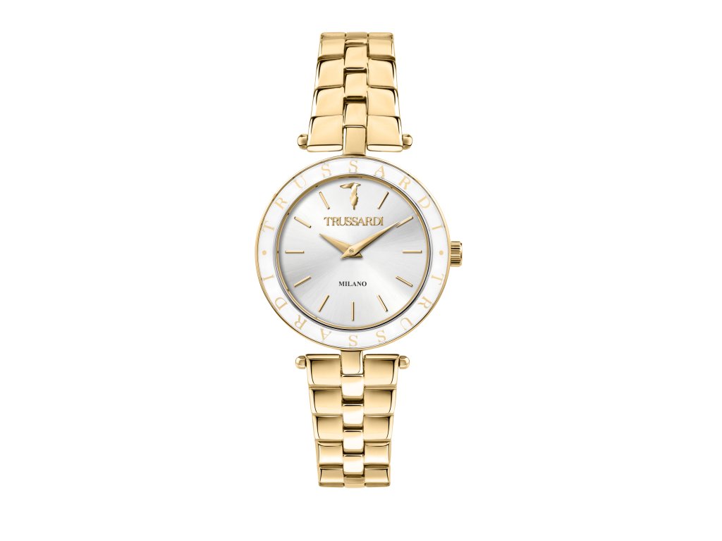 HODINKY TRUSSARDI WOMEN R2453145503 (34MM). Typ mechanizmu: QUARTZ. Displej: TYP: ANALÓGOVÝ. Materiál puzdra: MATERIÁL PUZDRA: OCEĽ. Farba puzdra: . Materiál náramku:: KOV. Farba náramku: ZLATÁ. Farba ciferníka: BIELA. Typ skla: SKLÍČKO: MINERÁLNE. Clousure: SKLENENÉ SKLO: FOLD-OUT. Priemer ciferníka: dĹŽKA CIFERNÍKA: 34 MM. Ponoriteľnosť: 5 ATM