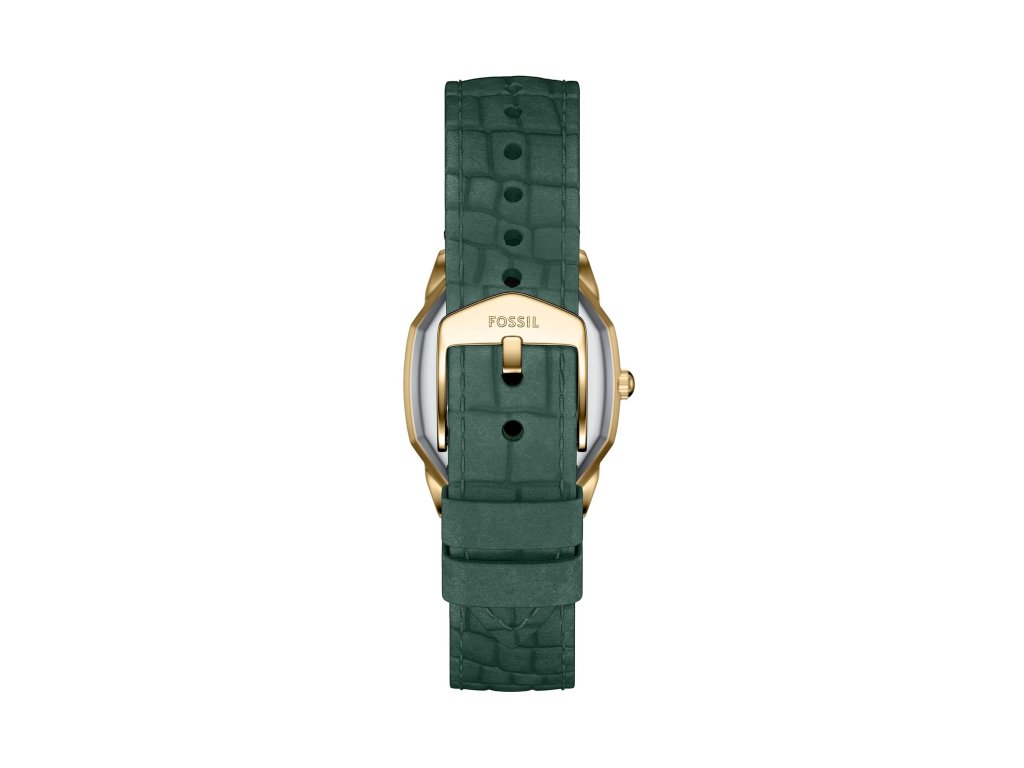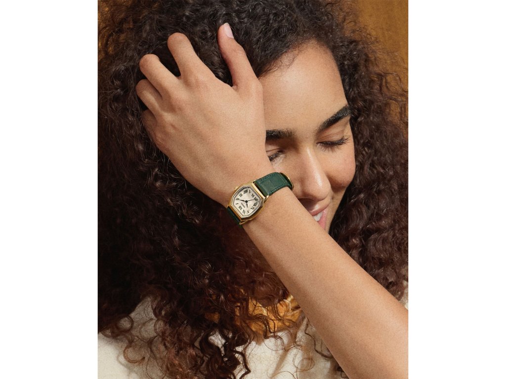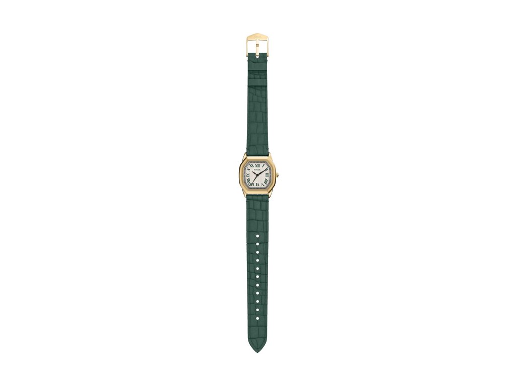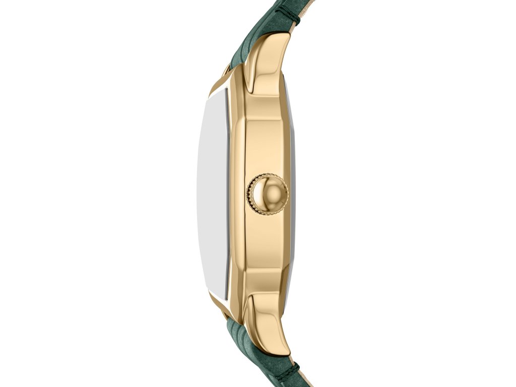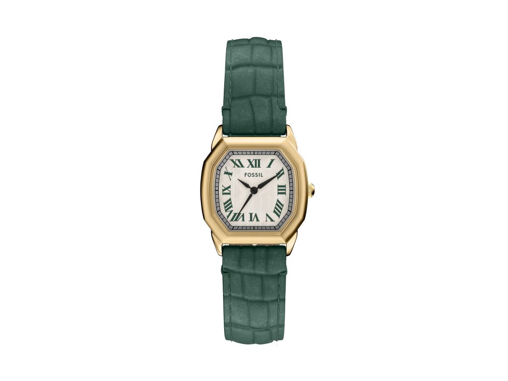 Osemuholníkové puzdro zlatej farby dodáva modelu luxusný vzhľad, zatiaľ čokrémový ciferník s rímskymi číslicami prináša jemný vintage akcent. Zelený kožený remienok s krokodílím vzorom dotvára celý dizajn a dodáva mu charakter.