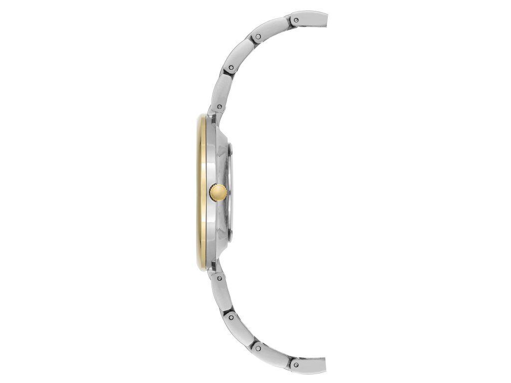 Model má dvojfarebný kovový ťah kombinujúci strieborné a zlaté odkazyktoré zodpovedajúokrúhle puzdro v zlatej farbe a svetlý ciferník. Dizajn je jednoduchý, prehľadný a ľahko kombinovateľný s iným príslušenstvom.Minerálne sklo chráni povrch hodiniek pred poškriabanímzatiaľ čo spoľahlivý quartzový mechanizmus zabezpečuje presnú prevádzku. Skvelá voľba pre ženy, ktoré hľadajú štýlový doplnok vhodný na každý deň.