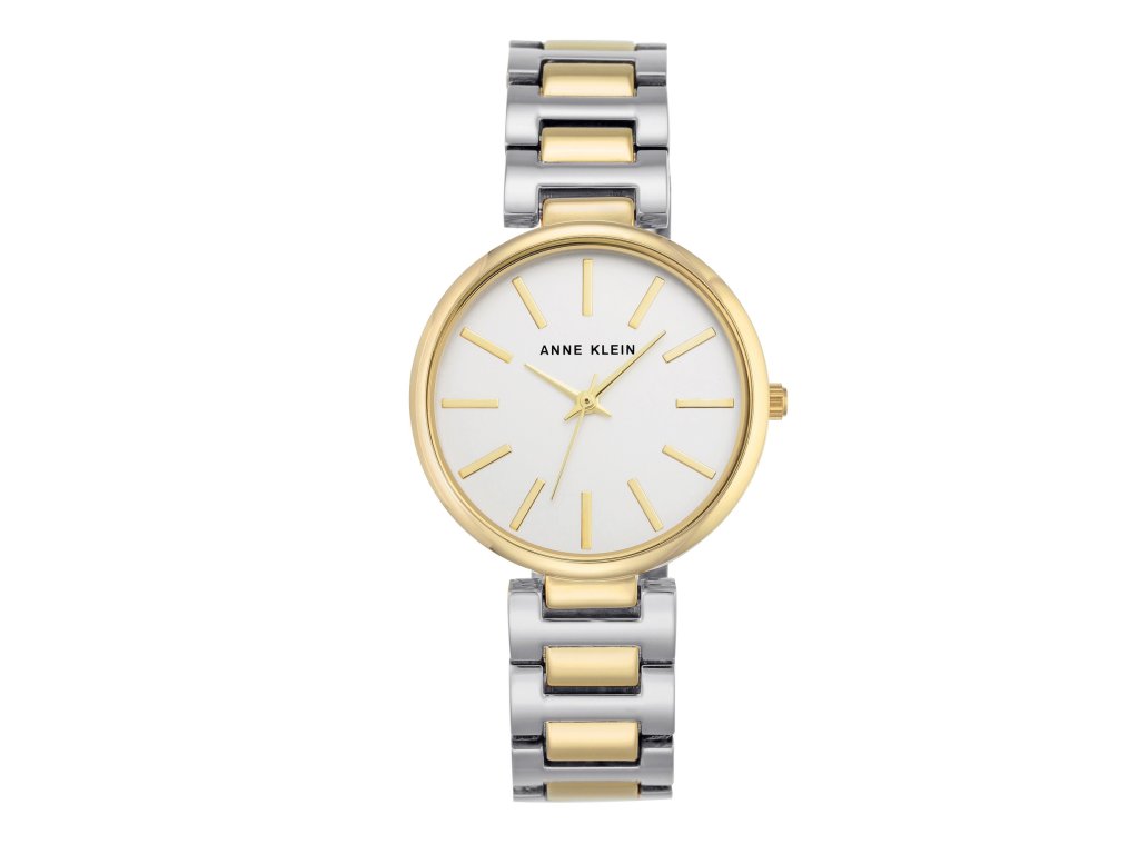 Hodinky Anne Klein v tradičných farbách sú ideálnou voľbou pre ženy, ktoré uprednostňujú čistý, elegantný štýl.Biely ciferník dopĺňa puzdro zlatej farby a dvojfarebný kovový remienok, čo vytvára nadčasový a všestranný vzhľad.
