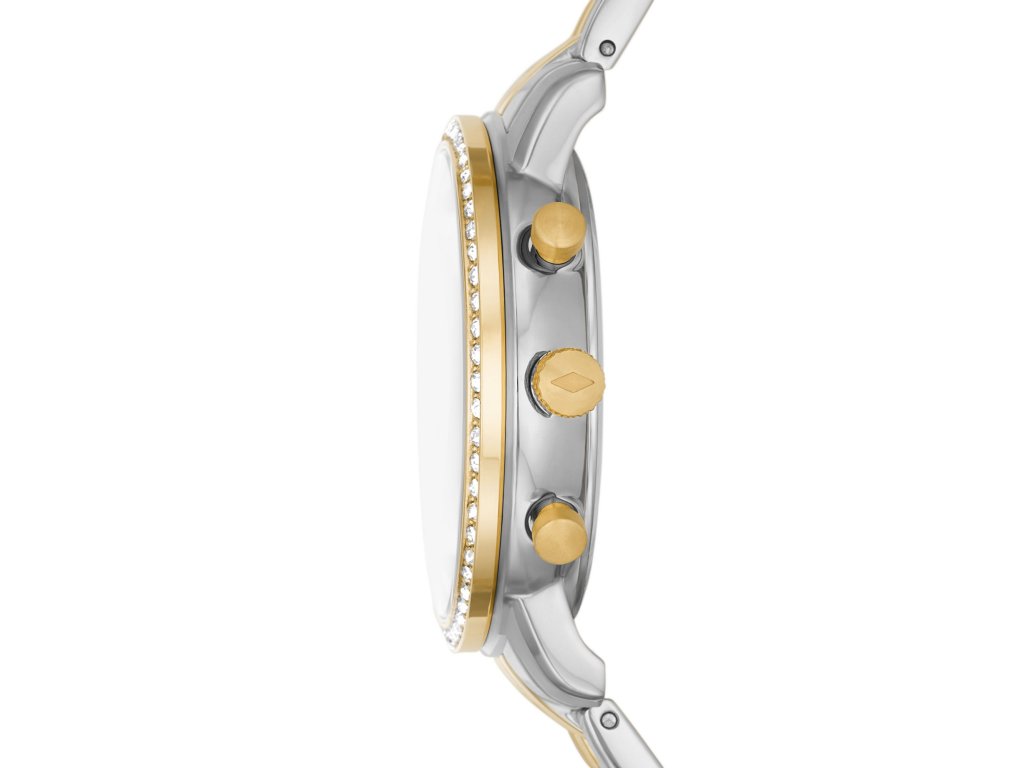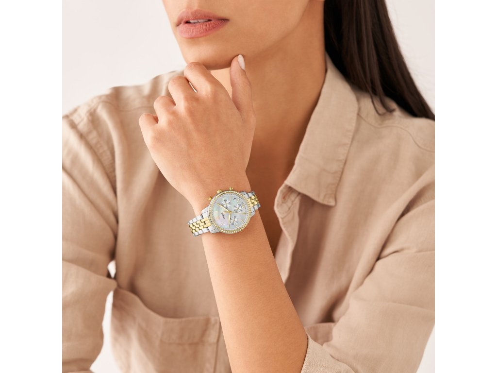 Moderný perleťový ciferník s priemerom 36 mm obsahuje chronograf, dátumovku a malé logo značky. Je lemovaný zlatými indexmi. Ciferník je zasadený do okrúhleho puzdra, ktoré jeosadené malými kryštálmi. Celý doplnok je potom dokonale zladený ťahadlom zloženým zo zlatých a strieborných oceľových článkov.
