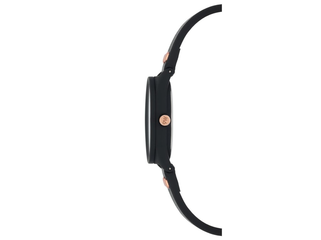 Čierny ciferník s výraznými, ale jemnými ručičkami, indexmi a číslicami z ružového zlata vytvára minimalistický vzhľad a kontrast.