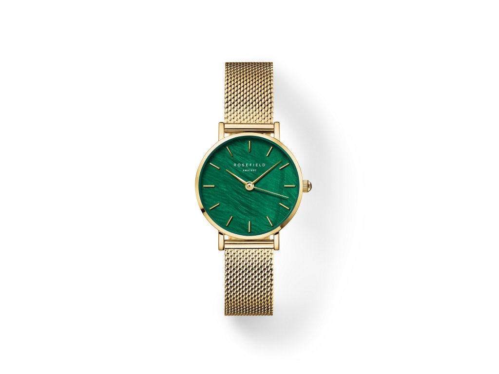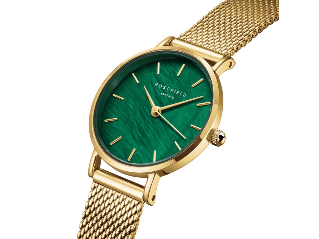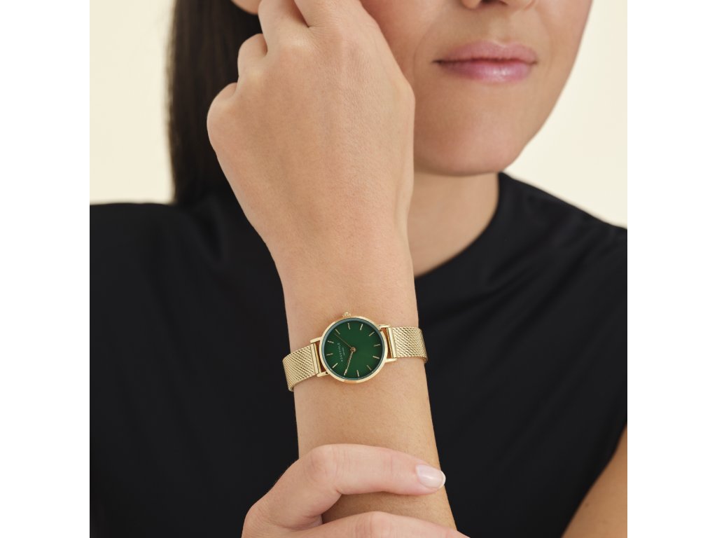 Milánsky ťah v zlatej farbe pôsobí veľmi žensky a decentne. Perleťová povrchová úprava tmavozeleného ciferníka vytvára na svetle zaujímavé farebné odlesky. Priemer puzdra je len 26 mm a hrúbka 6,5 mm, čo ocenia ženy s menšími zápästiami.