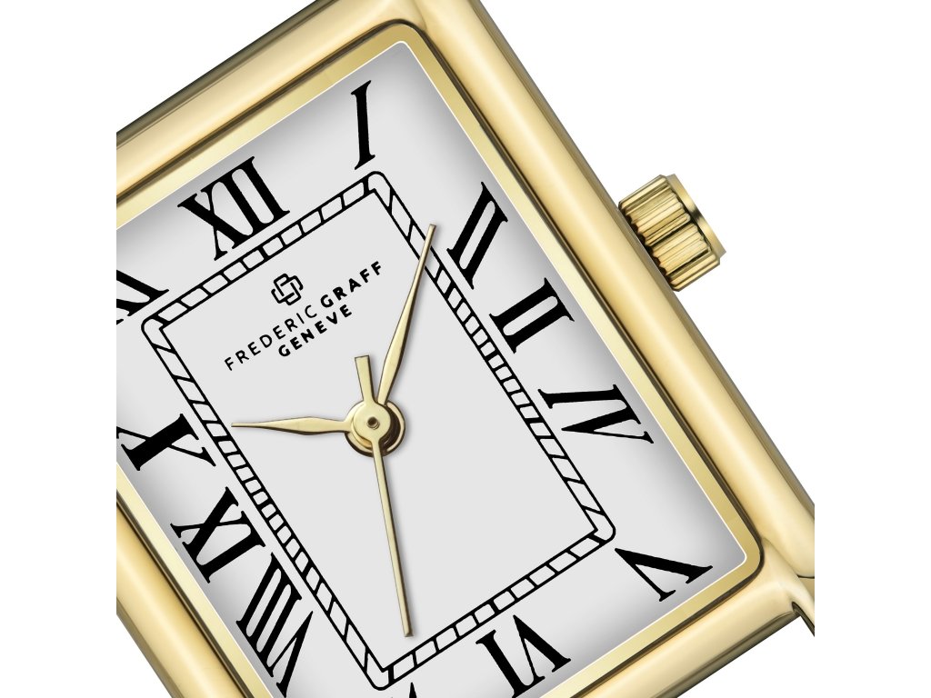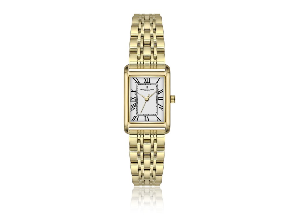 Minimalistický tvar v elegantnom zlatom tóne. Dámske hodinky Frederic Graff FFFN-5518GQ zaujmú čistými líniami a jednoduchým dizajnom, ktorý kombinuje puzdro zlatej farby s bielym ciferníkom v elegantnom kontraste. Štvorcový tvar dodáva modelu moderný nádych bez toho, aby stratil svoju rafinovanosť.