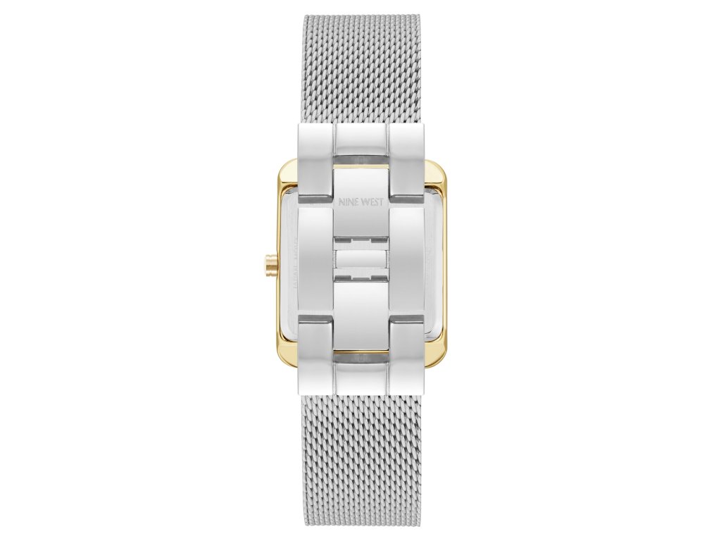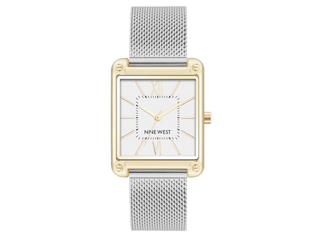 Štýlová kombinácia striebra a zlata v dámskych hodinkách Nine West s hranatým puzdrom.