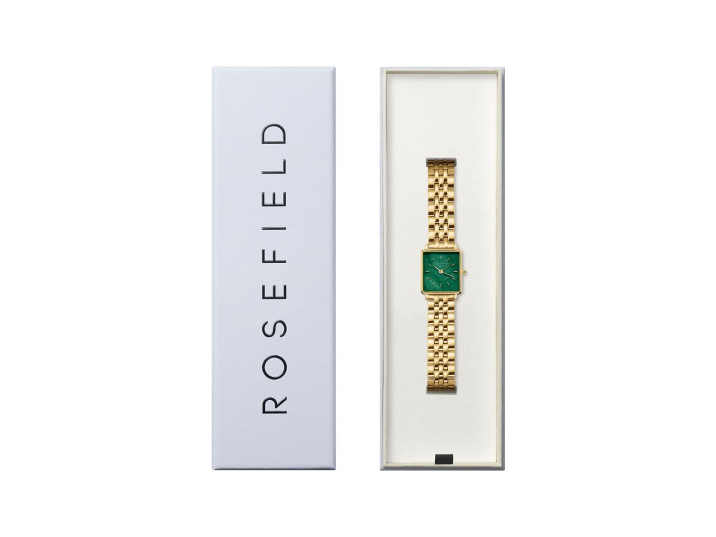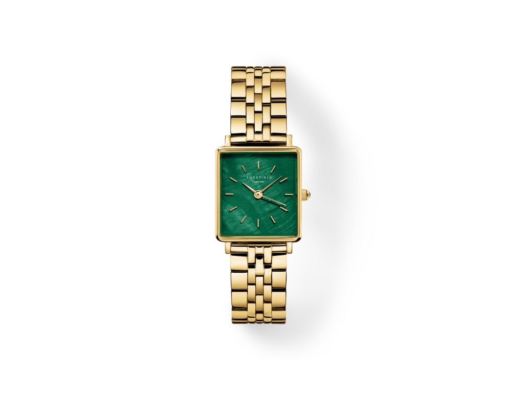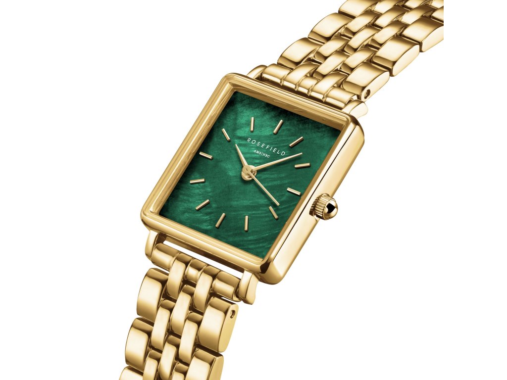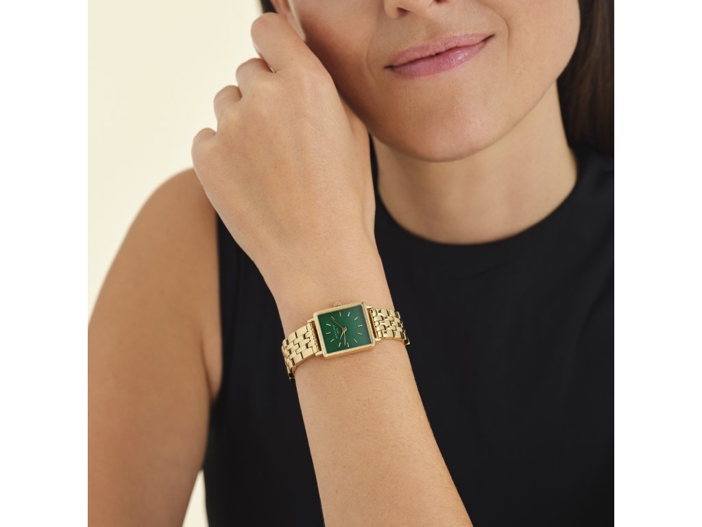 Tmavo zelenásmaragdový ciferník s perleťovým povrchom je zasadený do štvorcového zlatého puzdra a vyzerá ako drahokam. Vďaka masívnemu oceľovému mechanizmu s pozláteným povrchom získavajú hodinky vzhľad luxusného náramku.