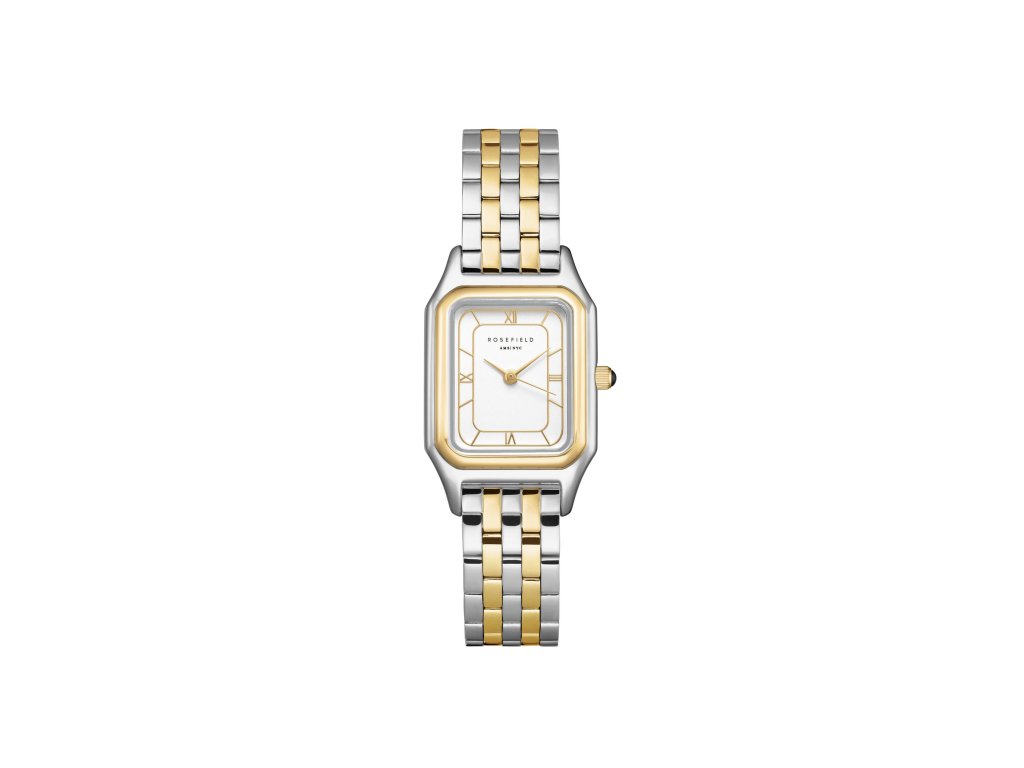 Model zaujme dvojfarebným dizajnom a štvorcovým puzdrom so zaoblenými hranami,ktorá jemne rámujebiely ciferník s rímskymi číslicami a tenkými ručičkami.