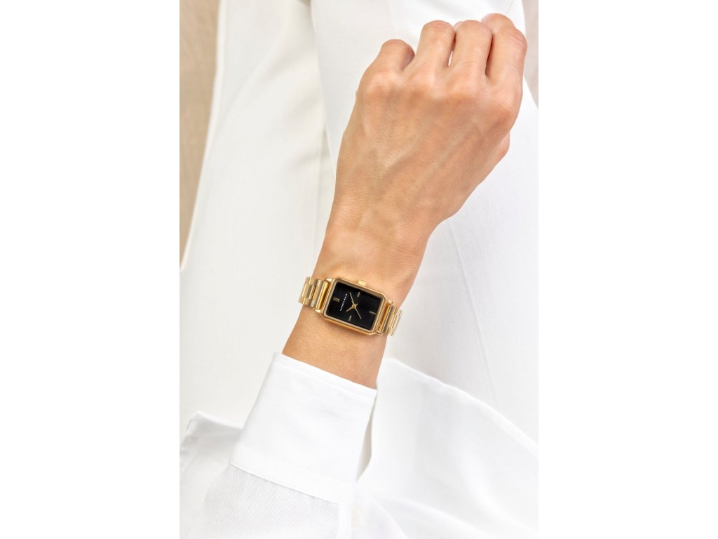 Čierny ciferník v tvare štvorca vytvára pôsobivý kontrast koceľový ťah v zlatej farbe apuzdro v zlatom tóne. Táto kombinácia vyzerá luxusne, ale zostáva univerzálna na každodenné nosenie. Minerálne sklo chráni ciferník pri bežnom používaní. Tento model je ideálny pre ženy, ktoré chcú doplnok s modernou geometriou a výrazným farebným kontrastom.
