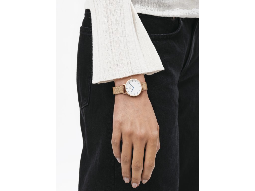 Na prvý pohľad vás zaujme ajrímske číslice namiesto tradičných indexov, ktoré dodávajú hodinkám osobitý charakter a vintage vzhľad.Jemný milánsky ťah je vyrobená z odolnej nehrdzavejúcej ocele a pozlátená ružovým zlatom.Vysoko kvalitné minerálne sklo chráni ciferník a poskytuje odolnosť proti poškriabaniu.