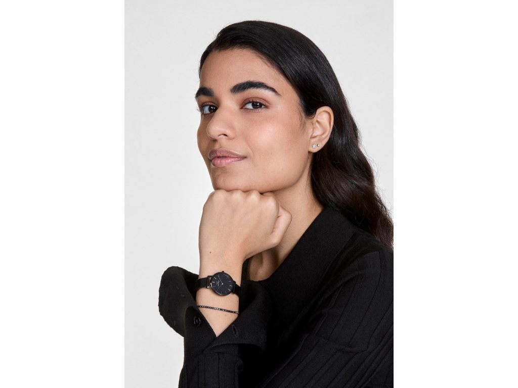 Dámske hodinky Petite Reflection od spoločnosti Daniel Wellington v sofistikovanej čiernej farbe súsymbol nadčasovej estetiky. Ichzrkadlové sklo zachytáva svetlo a odrazy okolia, čím vytvára jemný a meniaci sa efekt, ktorý sa mení pri každom pohybe ruky.