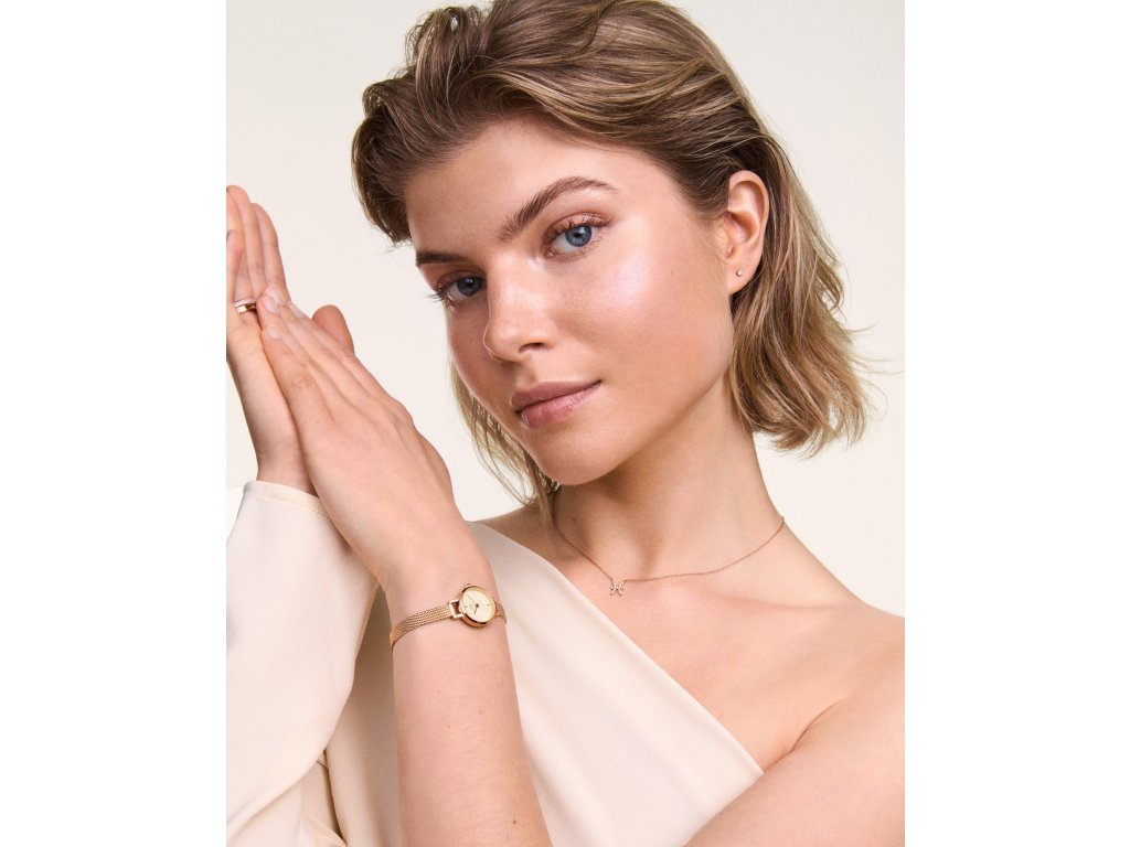 Béžový ciferník hodiniek je lemovaný vnútorným kruhovým prstencom, ktorý dodáva hodinkám extra eleganciu. Jemný remienok z nehrdzavejúcej ocele v ružovom zlate je vymeniteľný, takže hodinky môžete ľahko prispôsobiť svojej nálade a oblečeniu.
