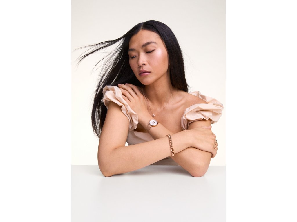 Jemný milánsky strojček z ružového zlata, ako aj 32 mm puzdro sú vyrobené z kvalitnej nehrdzavejúcej ocele.