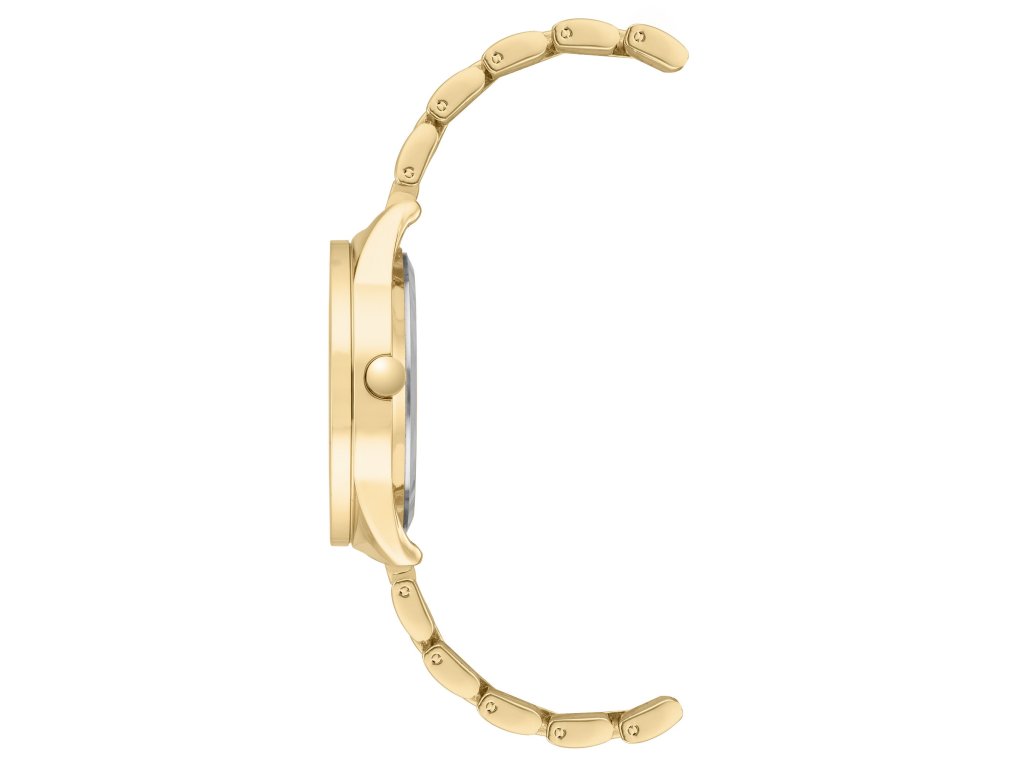 Analógové hodinky poháňané spoľahlivýmKremenný stroj a ich dizajn zaujme na prvý pohľad. Okrúhle puzdro a ťahadlo sú vyrobené z kovu vzlatej farbeako aj ciferník, ktorý zapadá do celkového monochromatického štýlu. Celok dotvára minerálne sklo.