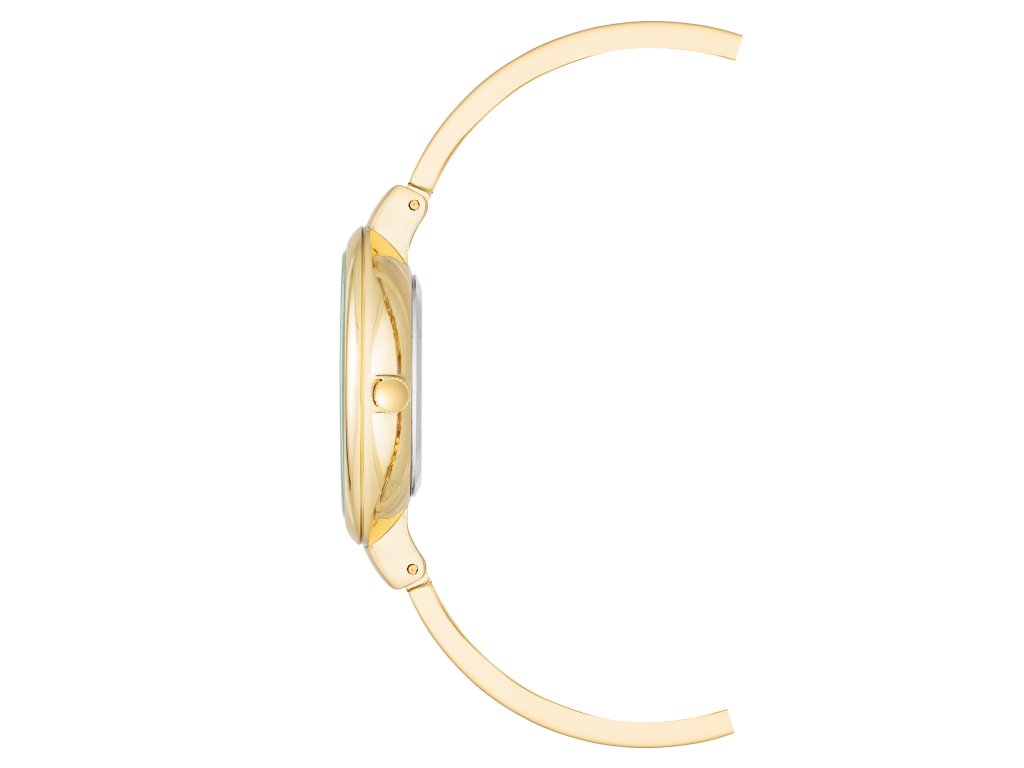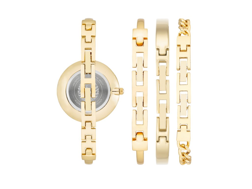 Náramky a remienok, ako aj puzdro hodiniek sú vyrobené zo zlatej kovovej zliatiny bez obsahu niklu. Každý z náramkov sa vyznačuje jedinečným detailom, ktorý ho robí nádherným. Jeden náramok je zdobený 37 trblietavými kryštálmi, ďalší bielym smaltom s lesklým povrchom a posledný vzorom pripomínajúcim retiazku. Ciferník v perleťovo bielej farbe je vyobrazený v okrúhlom puzdre s hrúbkou 9,3 mm a rozmermi 32 x 41 mm. Okrem indexov a ručičiek v zlatej farbe sa na ciferníku nachádza aj logo Anne Klein v čiernej farbe, ktorésa nachádza prakticky, a to v hornej strednej časti ciferníka.