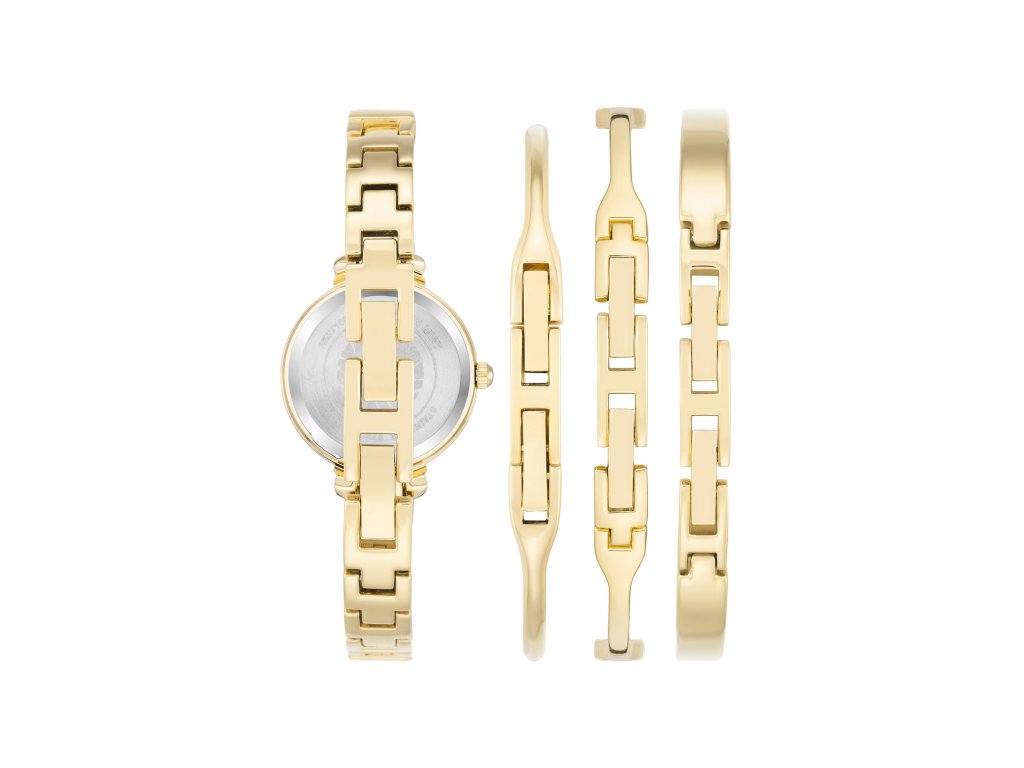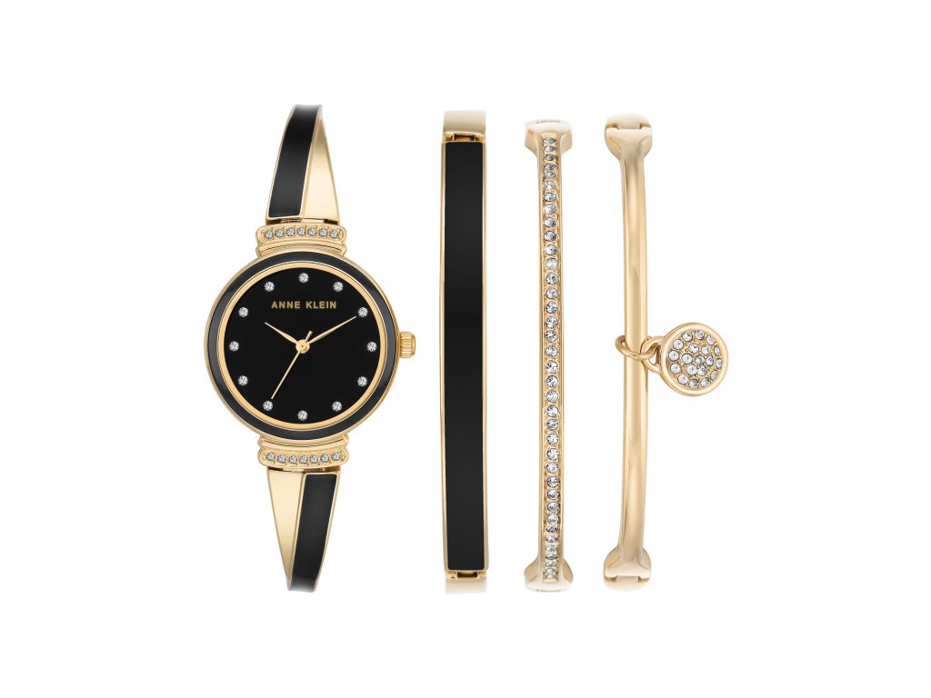 Náramky a remienok, ako aj puzdro hodiniek sú vyrobené z kovu. Zlatá farba puzdra s rozmermi 26 x 33,5 mm a hrúbkou 6,9 mm s lesklým čiernym okrúhlym ciferníkom vytváraveľmi pekný kontrast s luxusným nádychom. Vyniká aj 12 trblietavých krištáľových indexov, ktoré spolu s elegantnými zlatými ručičkami a logom Anne Klein plnia nielen praktickú funkciu, ale dávajú vyniknúť aj kráse ciferníka. Náramok s čiernou smaltovanou povrchovou úpravou, doplnok zdobený kryštálmi a šperk jednoduchého dizajnu s príveskom, v ktorom sú osadené ďalšie kryštály, vyzerajú skvostne či už k šatám alebo džínsom.