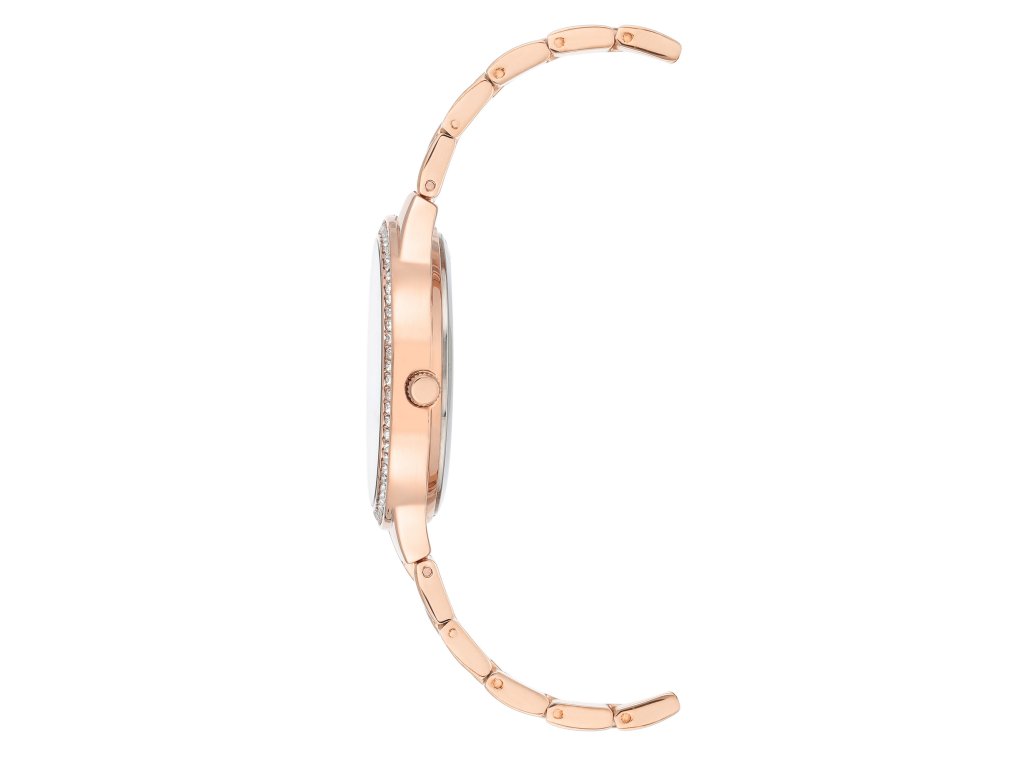 Remienok hodiniek zložený z článkov, puzdro a náramok sú vyrobené z bezniklovej kovovej zliatiny vo farbe ružového zlata. Perleťovo biely ciferník zasadený do okrúhleho puzdra zdobeného čírymi kryštálmijemné kvetinové vzorydominujú zlaté ruky a ružovkasté kryštály. V hornej časti ciferníka sa nachádza malé logo značky v čiernej farbe. Retiazka jednoduchého dizajnu s drobnými očkami je na oboch stranách zdobená malými bielymi korálkami, ktoré sú zakončené dvoma zlatými karabínkami na jednoduché zapínanie.