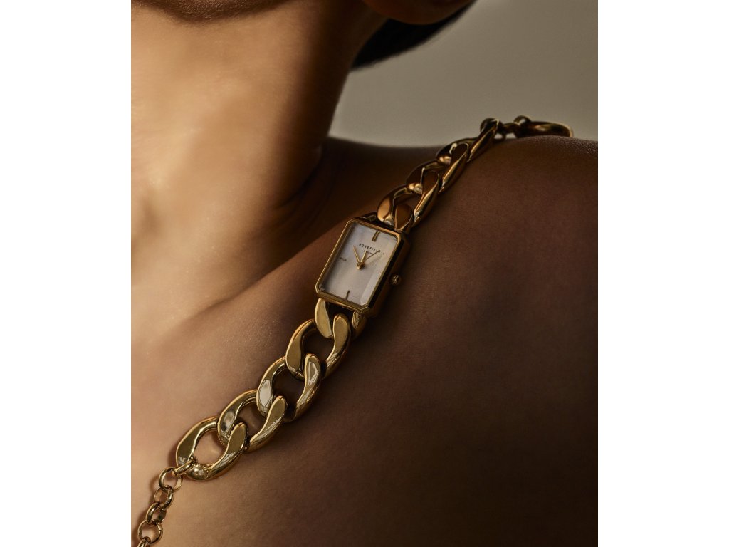 Obdĺžnikové náramkové hodinky s bielym ciferníkom a zlatým prepleteným náramkom