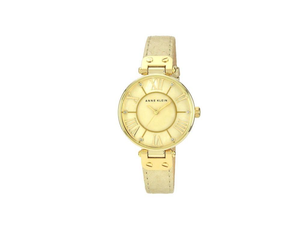 Efektné pozlátené hodinky s koženým remienkom a zlatými detailmi. Značka Anne Klein, pomenovaná po slávnej americkej vizionárke, prináša všetkým ženám možnosť vyjadriť sa niečím tak praktickým, ako sú hodinky. Okrúhly ciferník s perleťovým efektom zdobia kryštály a indexy v podobe prúžkov a rímskych číslic. Celok dopĺňa 34 mm pozlátené puzdro a remienok zakončený drobnou sponou. Ochranu zabezpečuje vysoko odolné minerálne sklíčko.
