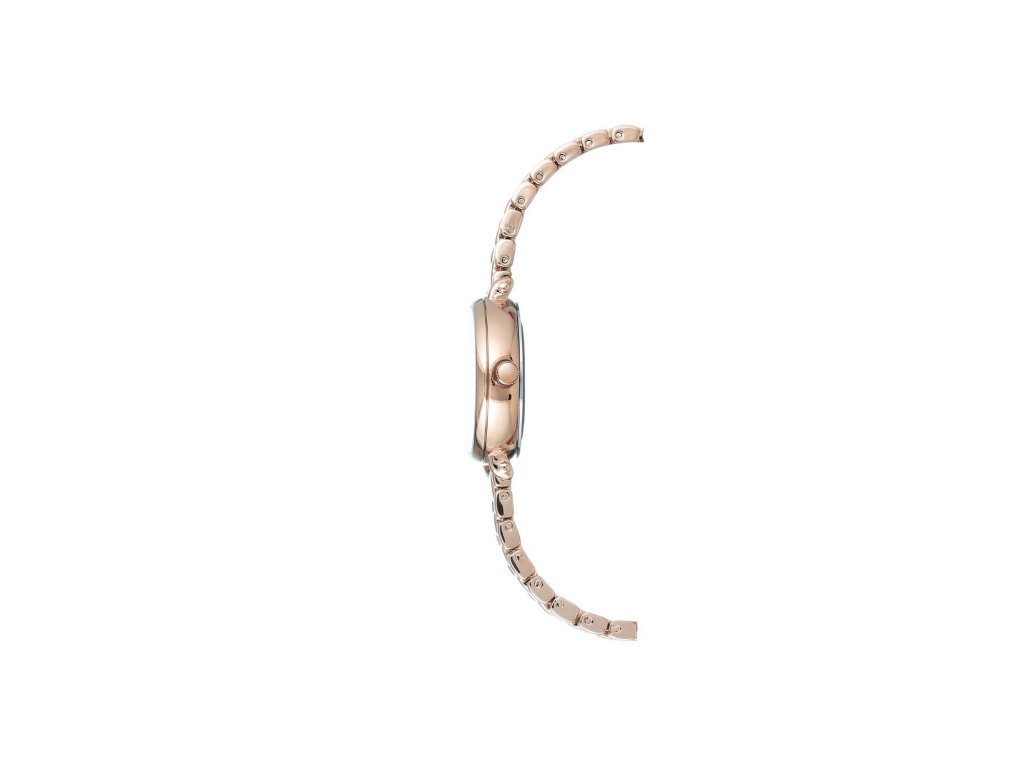 Elegantné hodinky s kovovým remienkom a striebornými detailmi. Značka Anne Klein, pomenovaná po slávnej americkej vizionárke, prináša všetkým ženám možnosť vyjadriť sa niečím tak praktickým, ako sú hodinky. Strieborný ciferník dopĺňajú zlaté bodové indexy a trblietavé kryštály. Kovový remienok z ružového zlata poskytuje výrazný kontrast. Hodinky chráni minerálne sklíčko a subtílne puzdro s priemerom 25,5 mm. O jednoduché zapínanie sa stará klenotnícka spona.