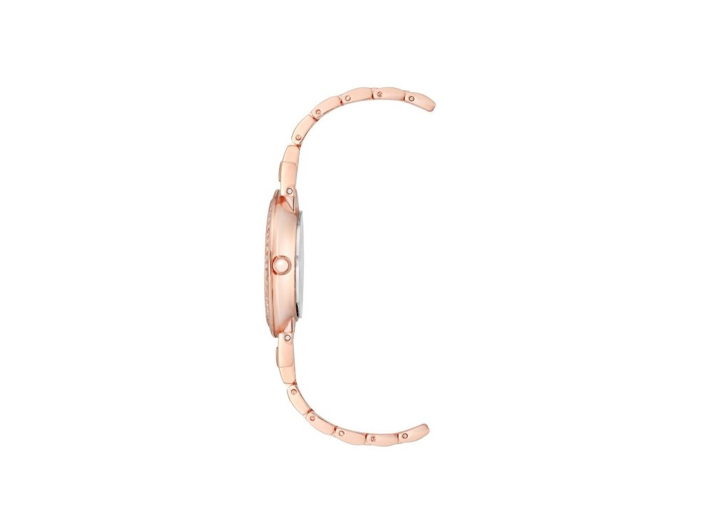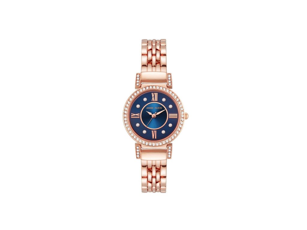 Elegantné hodinky v odtieňoch modrej a ružového zlata. Značka Anne Klein, pomenovaná po slávnej americkej vizionárke, prináša všetkým ženám možnosť vyjadriť sa niečím tak praktickým, ako sú hodinky. Tmavomodrý ciferník zdobia indexy z ružového zlata v podobe rímskych číslic a drobných kryštálikov. Kovový remienok v ružovom zlate poskytuje výrazný kontrast. Hodinky chráni minerálne sklíčko a puzdro s priemerom 31 mm. Jednoduché zapínanie zabezpečuje klenotnícka pracka.